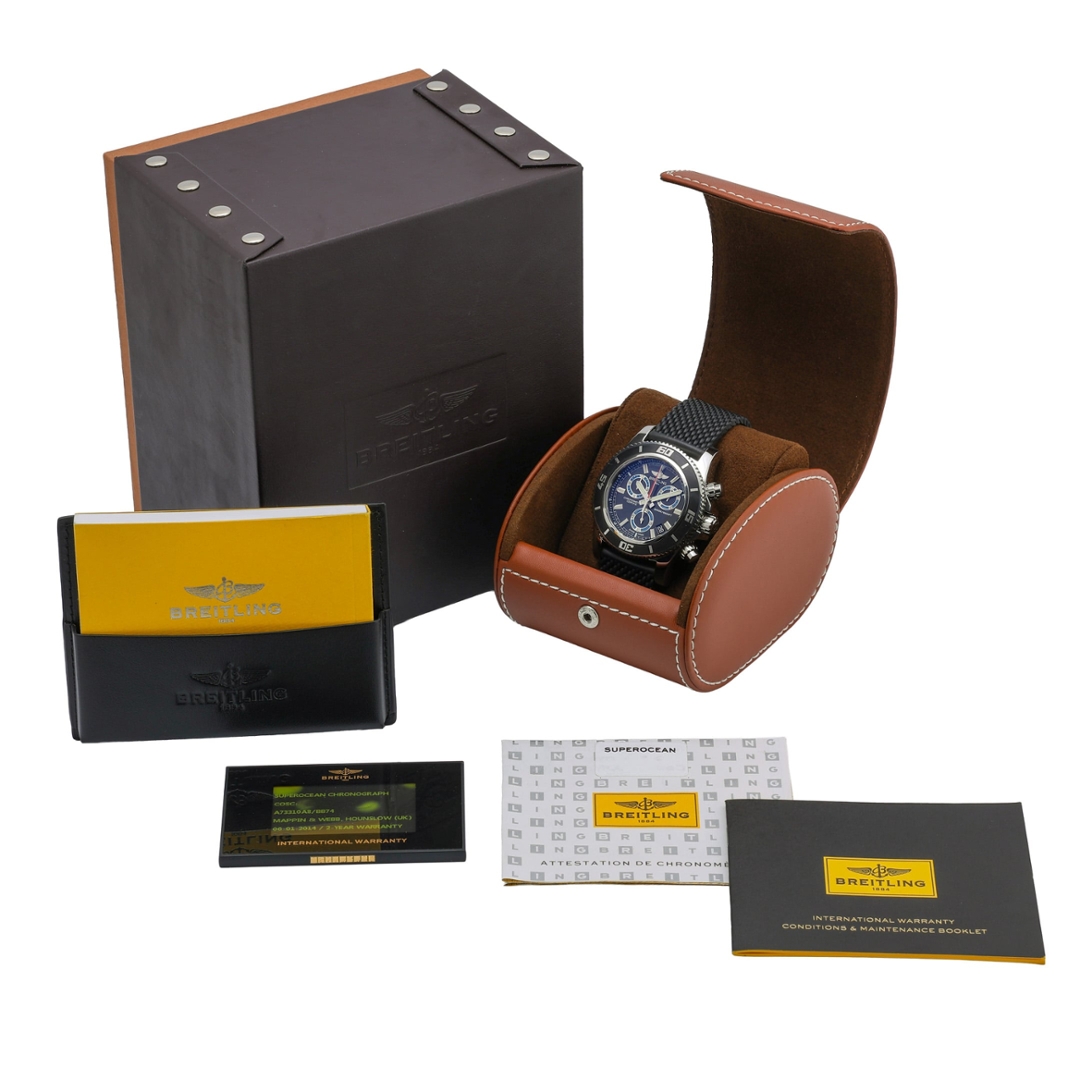 Completing the watch is a durable black rubber strap secured with a stainless steel clasp, designed to offer comfort and flexibility in demanding environments. Bold, highly capable, and engineered for serious underwater performance, the Breitling Superocean Chronograph stands as one of the brand’s most powerful professional dive watches.