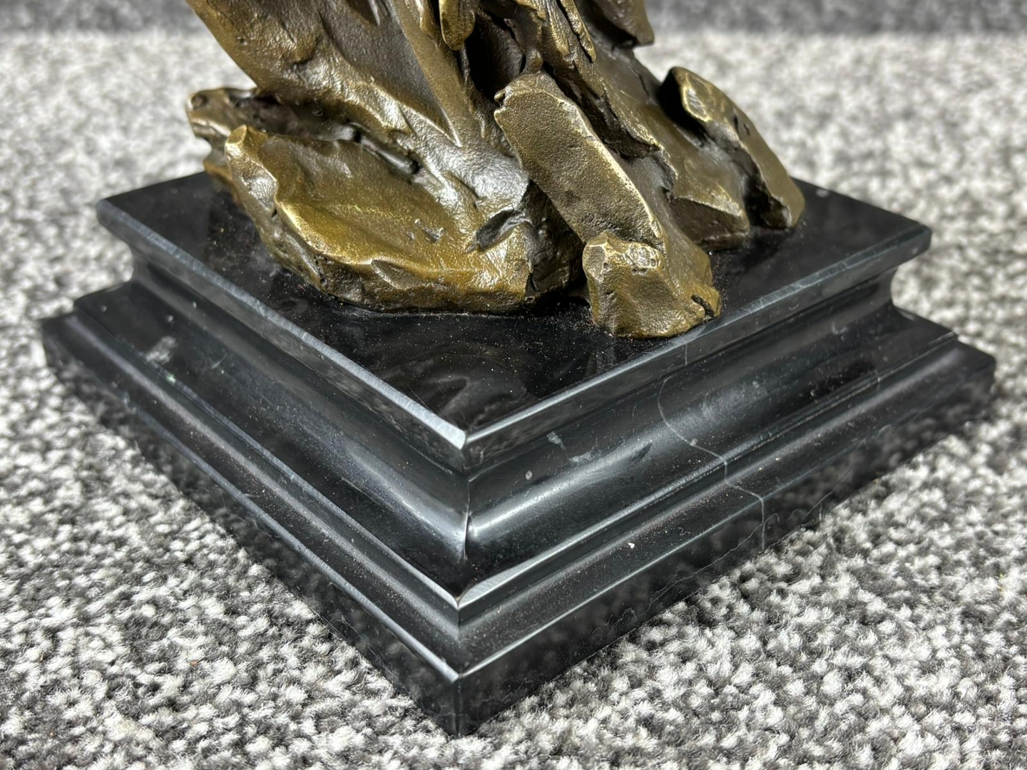 Finished in a warm bronze tone, the sculpture is set upon a tiered black base that provides contrast and elevates its display appeal. Measuring approximately 32cm in height, 13cm in width, and 13cm in depth, it offers a well-balanced and visually engaging size suitable for a range of interior settings.