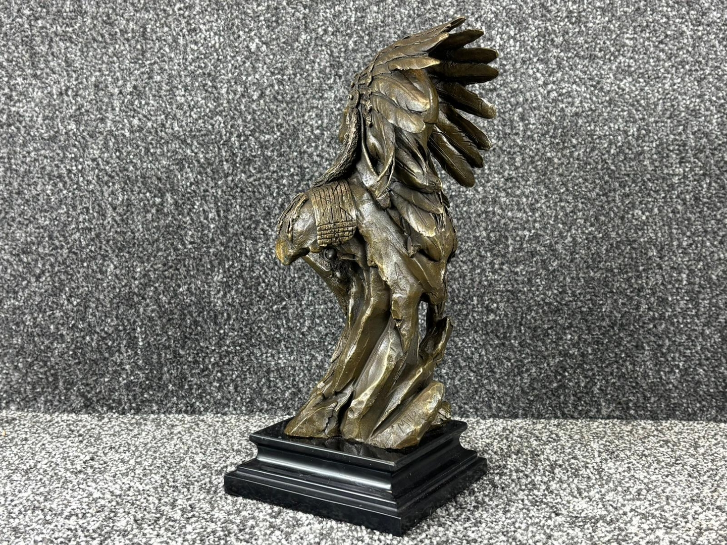 A bronze sculpture of a Native American Chief with an Eagle on a black base. Approx 32cm height, 13cm width, 13cm depth.