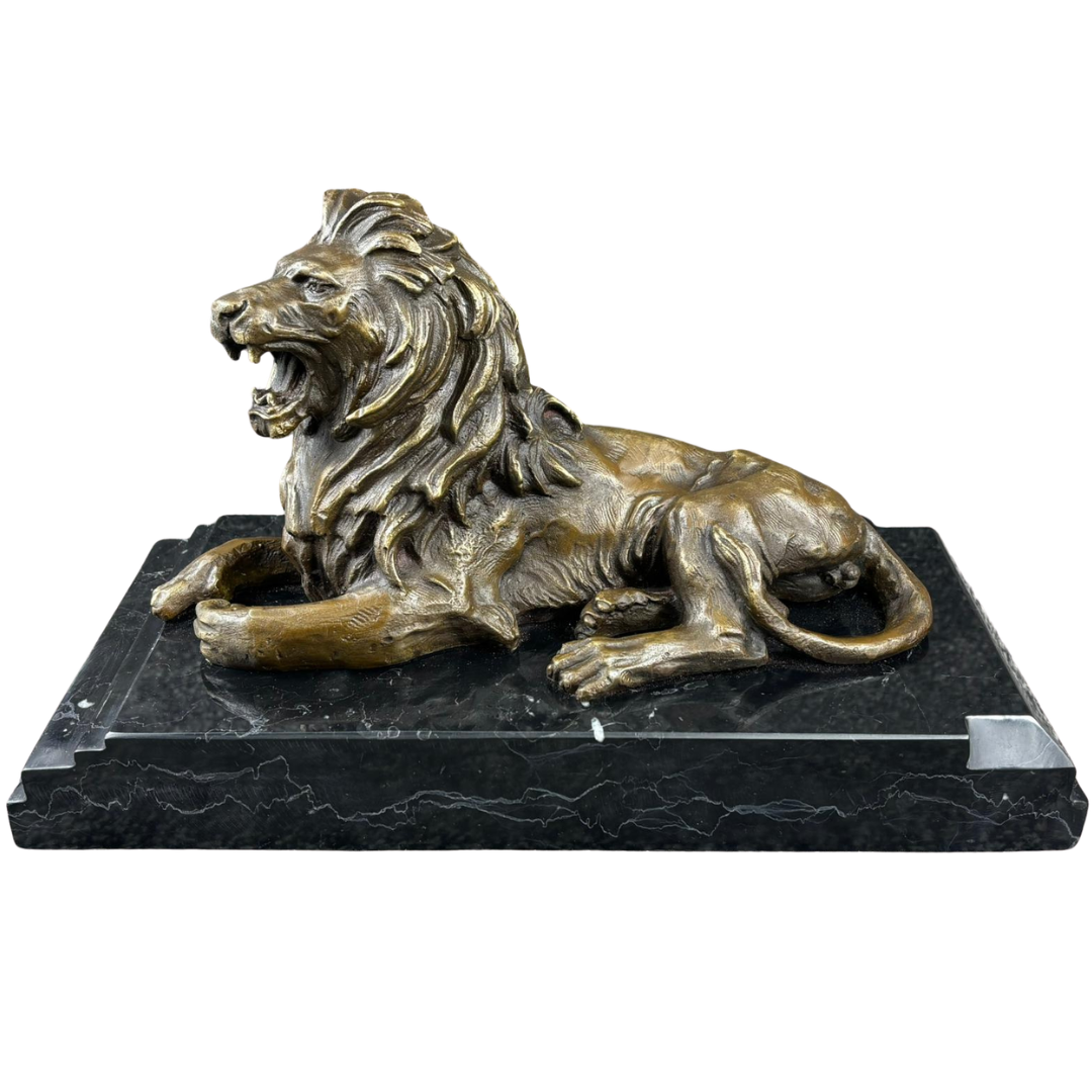 A powerful bronze sculpture of a roaring lion, captured in a commanding reclining pose that conveys strength, authority, and presence. The open mouth and detailed facial expression bring intensity to the piece, while the flowing mane and defined musculature showcase skilled craftsmanship and attention to detail. The composition balances movement and stillness, creating a striking visual impact.