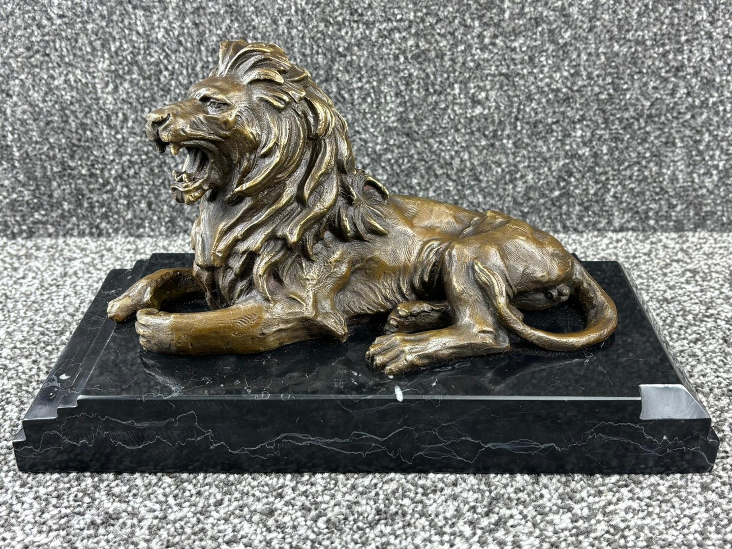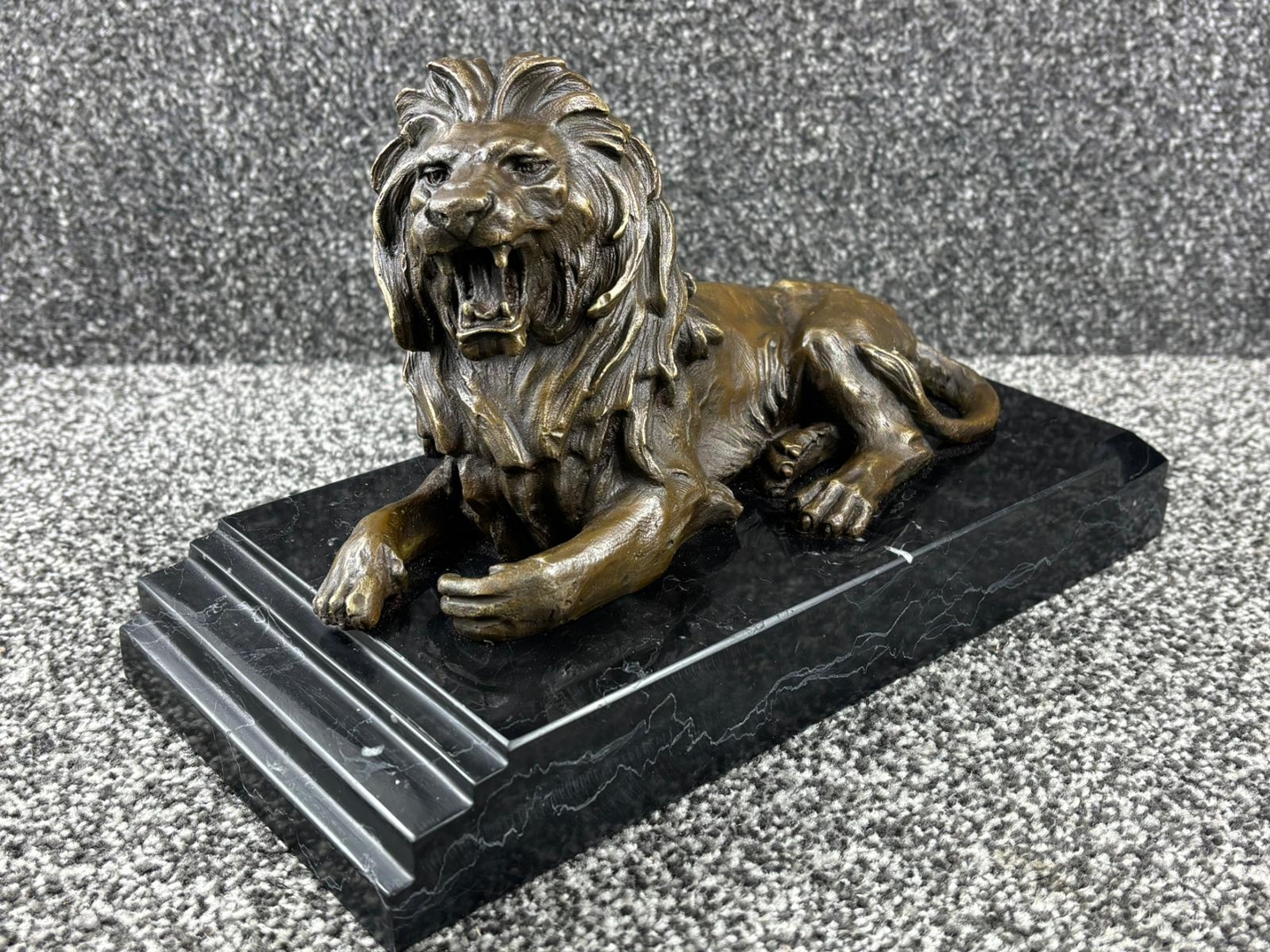 A bronze sculpture of a Roaring Lion on a black base. Approx 19cm height, 31cm width, 15cm depth.