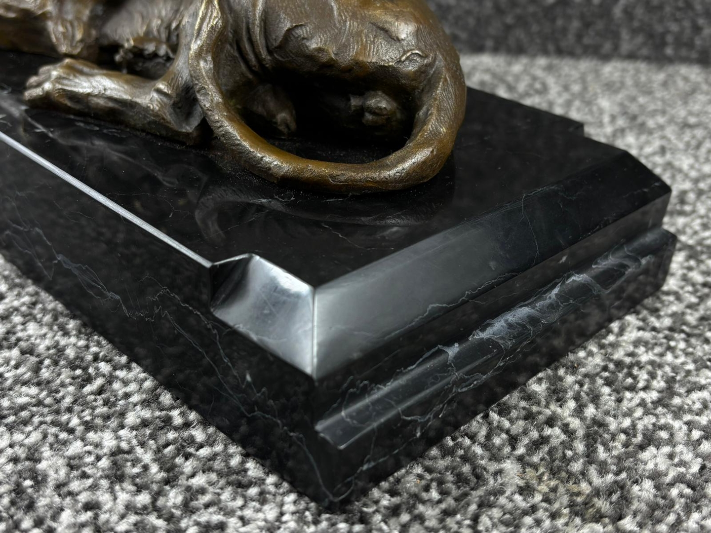 Finished in a rich bronze tone, the sculpture is mounted on a rectangular black base that enhances contrast and presentation. Measuring approximately 19cm in height, 31cm in width, and 15cm in depth, it offers a substantial yet versatile display size, ideal for a range of interior settings from desks to mantelpieces.
