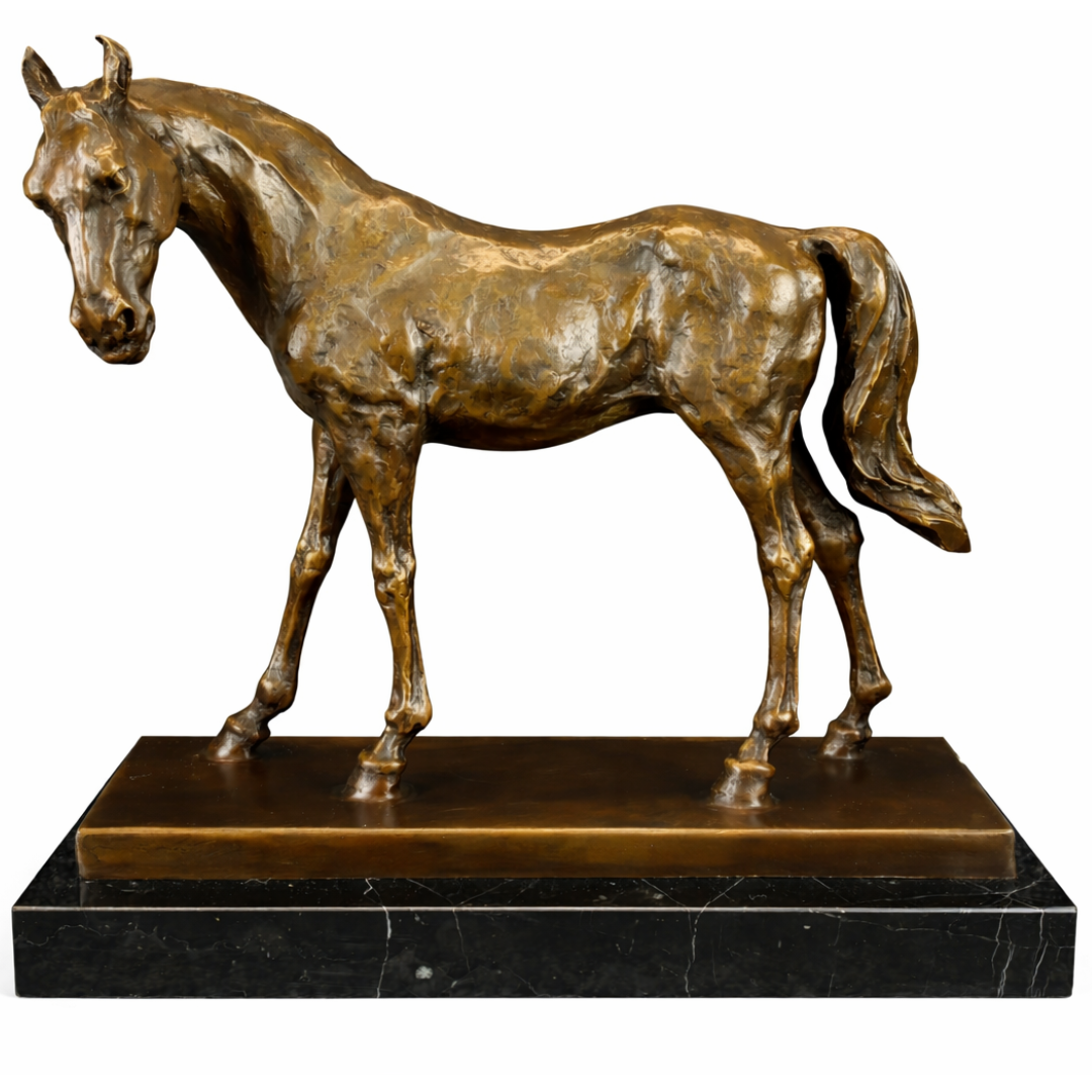 A finely cast bronze sculpture of a standing horse, captured in a calm yet attentive pose that highlights the natural strength and elegance of the animal. The composition focuses on form and balance, with subtle musculature and a gently lowered head conveying a sense of quiet presence. The textured surface and flowing lines of the mane and tail add depth and character to the piece.