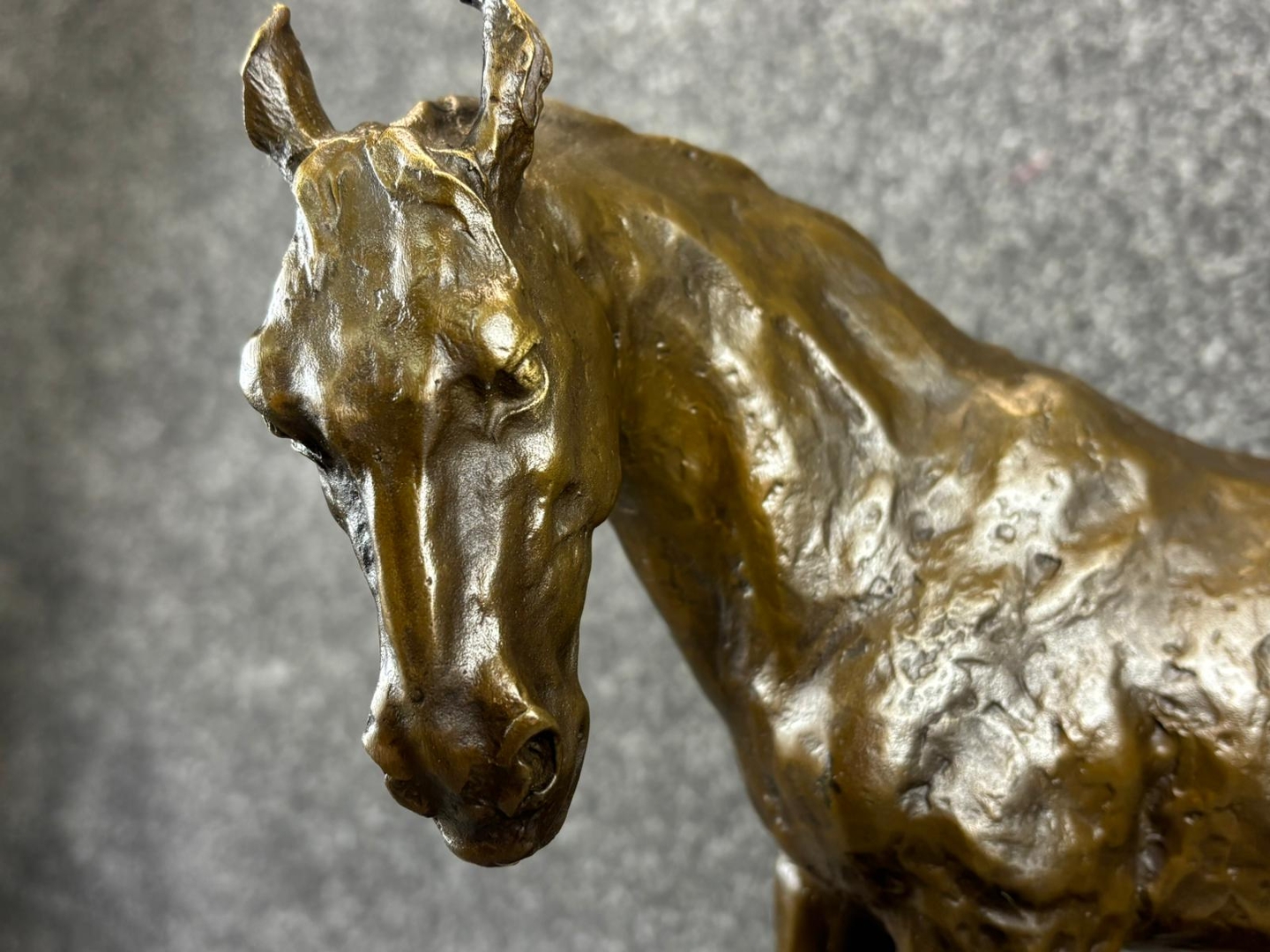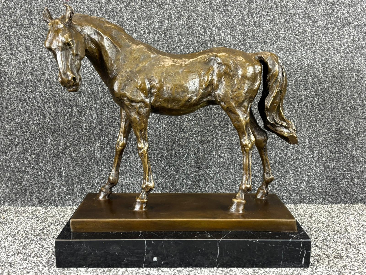 A bronze sculpture of a Standing Horse on a black base. Approx 35cm height, 36cm width, 18cm depth.