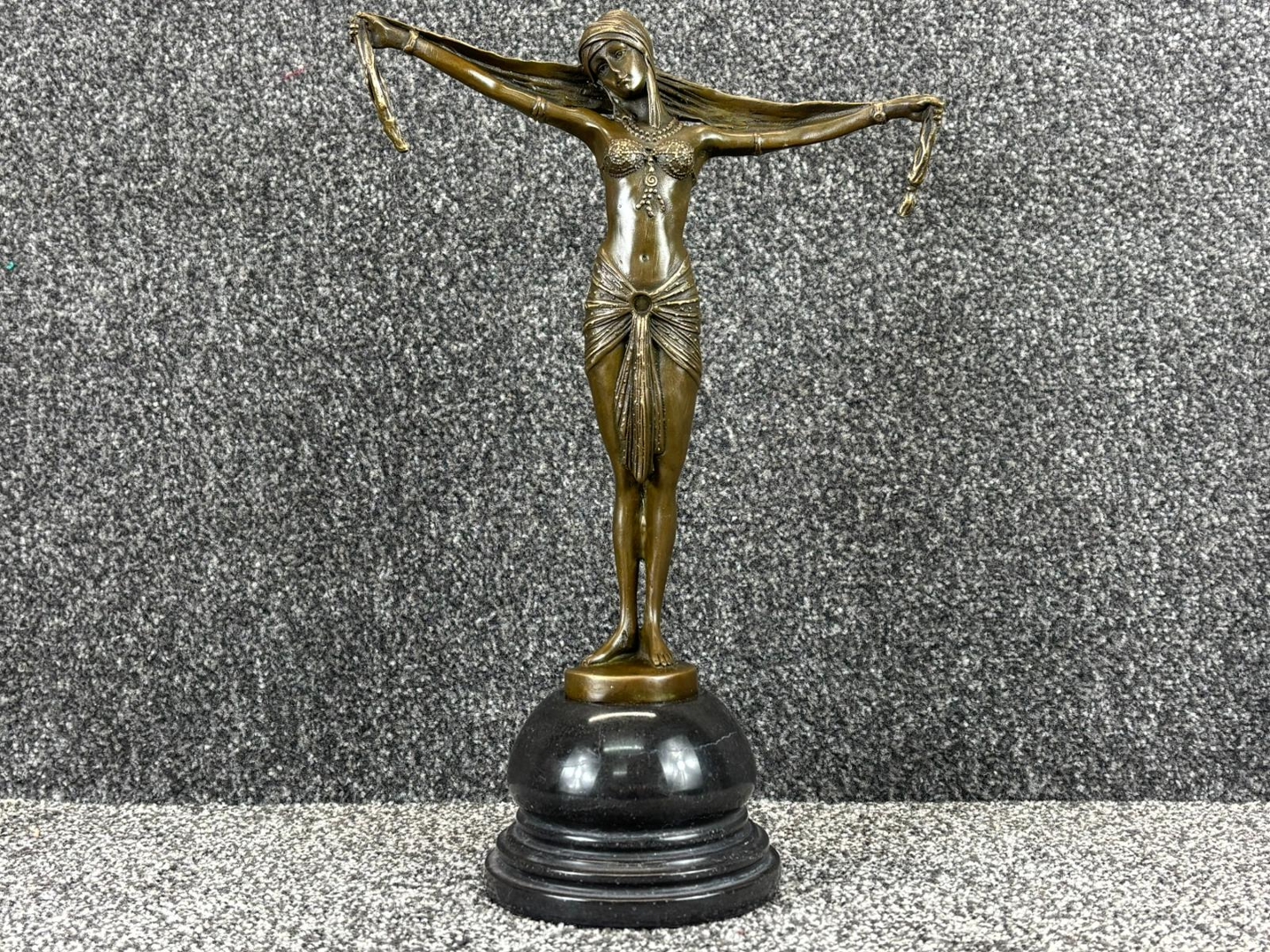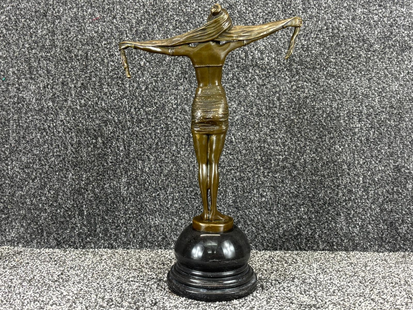 A bronze sculpture of an Art Deco Dancer with Outstretched Arms on a black base. Approx 39cm height, 25cm width, 13cm depth.