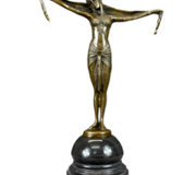 The deep bronze finish gives the piece an industrial, aged look, while the smooth, minimalist design adds an air of modernity. Set on a sleek black marble base, the sculpture stands out as a symbol of imagination and mystery, invoking themes of isolation, exploration, and the innocence of youth. This artwork beautifully combines whimsy with deeper social commentary, characteristic of Banksy’s style.
