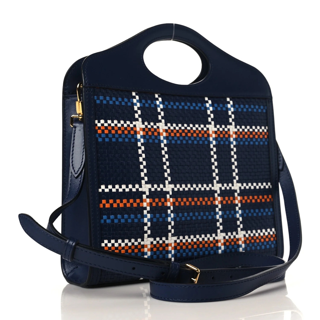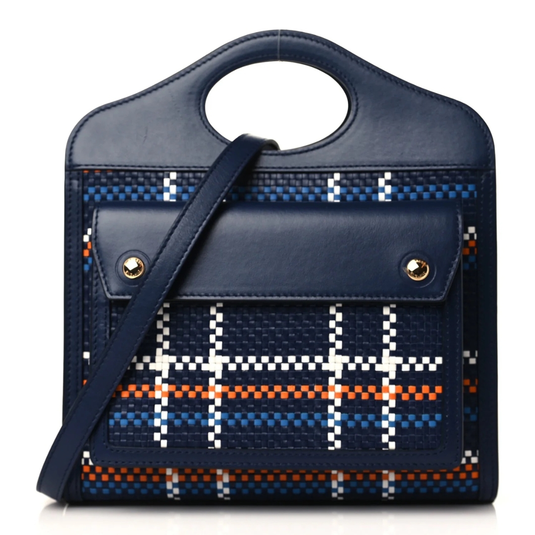 A brand new Burberry blue smooth calf leather with woven check panel Banner Top Handle bag, Approximately 26cm height, 23cm width.