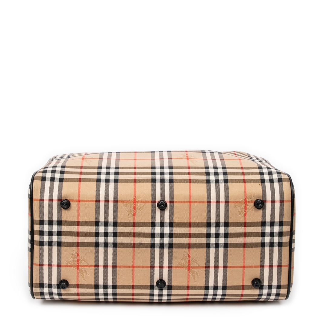A vintage Burberry beige and black canvas Medium Travel Boston bag that perfectly captures the brand’s signature British heritage and timeless elegance. Crafted from Burberry’s instantly recognisable check canvas, this piece combines a classic beige base with black, white, and red detailing for a look that is both iconic and effortlessly stylish. The structured silhouette is complemented by black leather handles and trim, adding durability and sophistication.