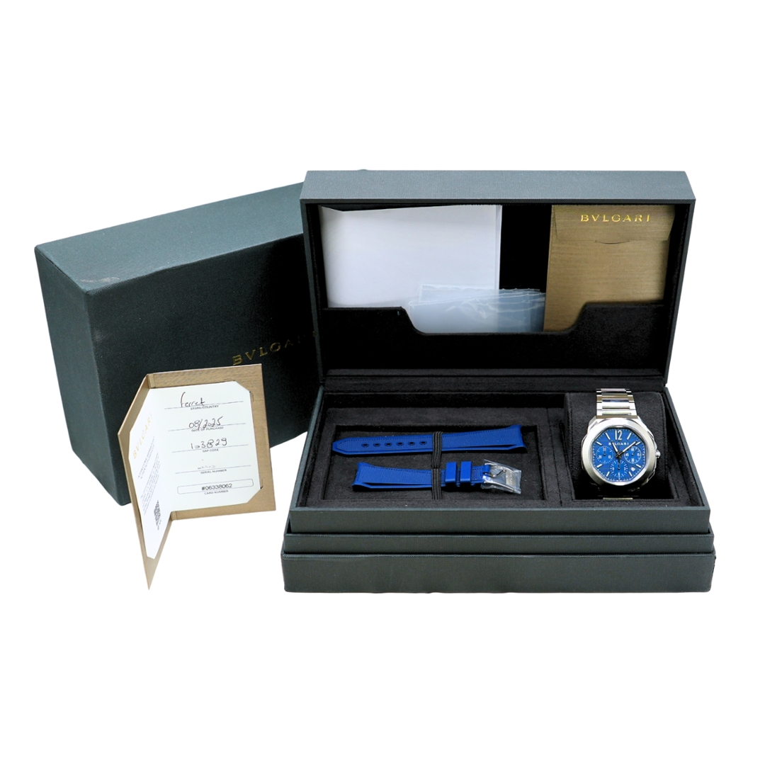 This 2025 example is offered in immaculate, unworn condition, complete with its original Bvlgari box, full paperwork, and a 12-month warranty from WLC. For collectors and enthusiasts alike, the Octo Roma represents more than just a chronograph — it is a contemporary icon that reflects Bvlgari’s mastery in both design and horological innovation. A true statement piece built for the modern era.