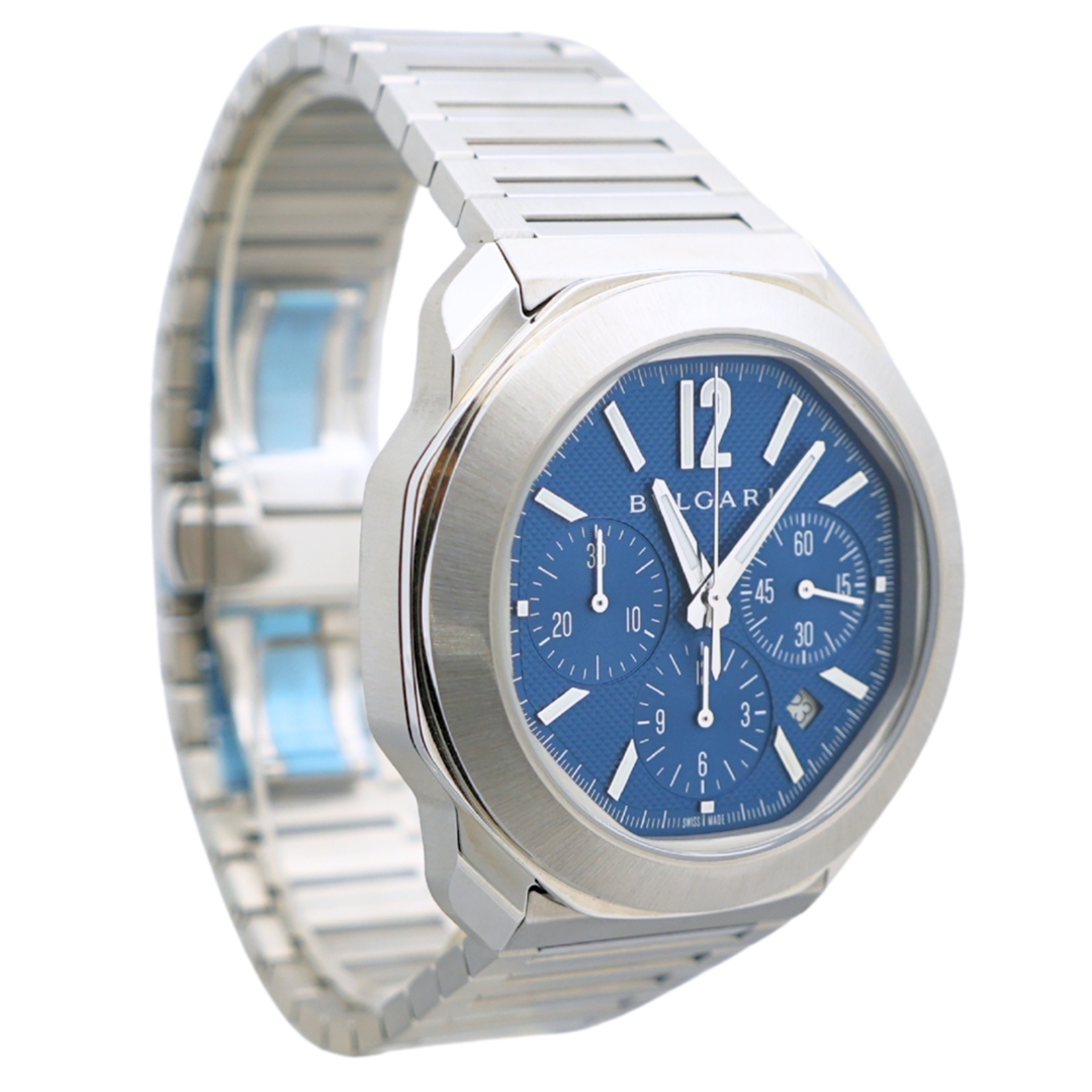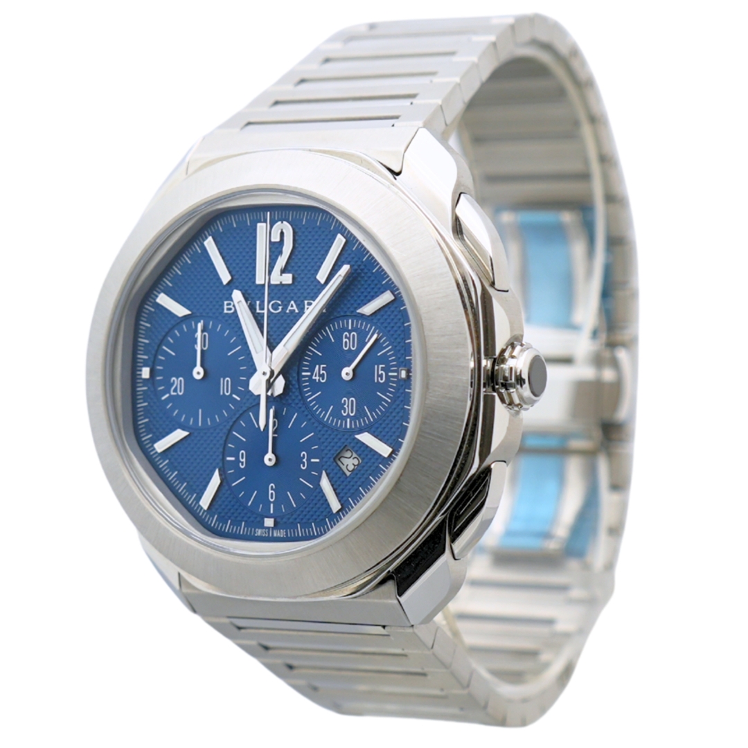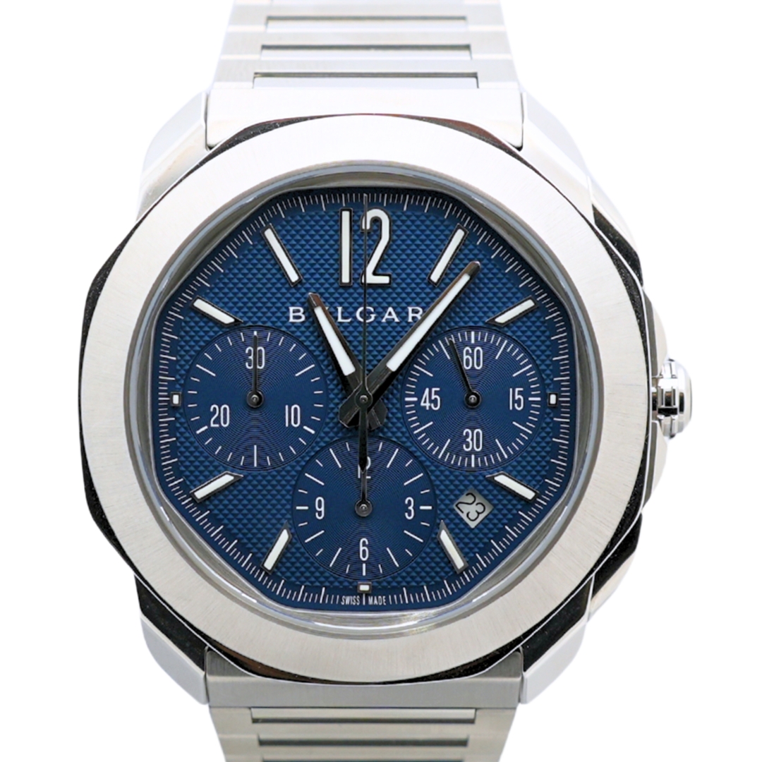 A Bvlgari Octo Roma 103829 is a bold expression of contemporary Italian design combined with fine Swiss watchmaking. Crafted in stainless steel, this 42mm chronograph features the instantly recognisable Octo case — a sophisticated blend of round and angular lines that lends it a commanding wrist presence. The striking blue dial, with its textured finish and applied indices, is complemented by three chronograph subdials, adding both balance and functionality to its aesthetic.