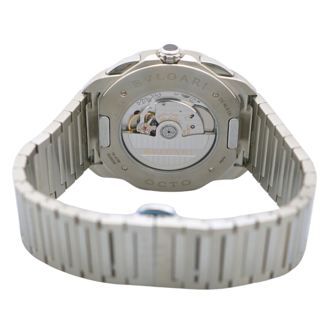 At its heart, the Octo Roma is powered by a precise automatic movement, delivering both reliability and performance for everyday wear. The chronograph functions allow for accurate timing, while the subtle date window, positioned between 4 and 5 o’clock, enhances practicality without interrupting the clean layout of the dial. Paired with a robust integrated stainless steel bracelet, this watch seamlessly blends sporty character with refined elegance, making it as versatile as it is eye-catching.