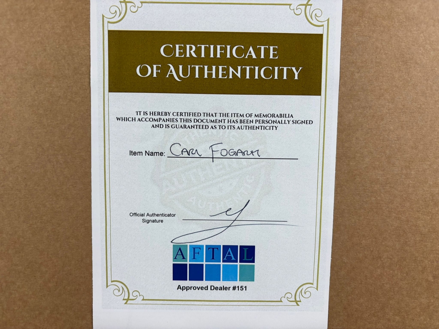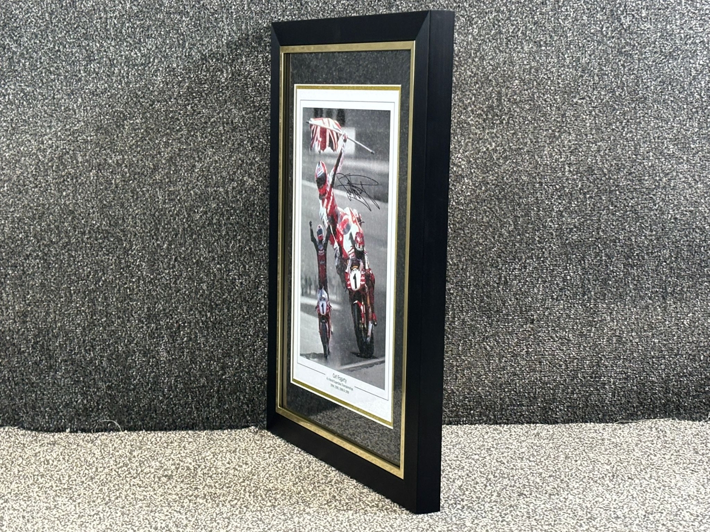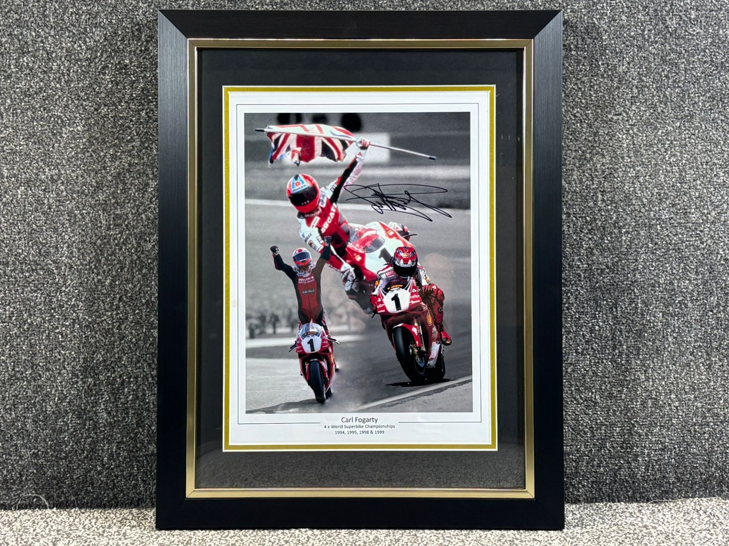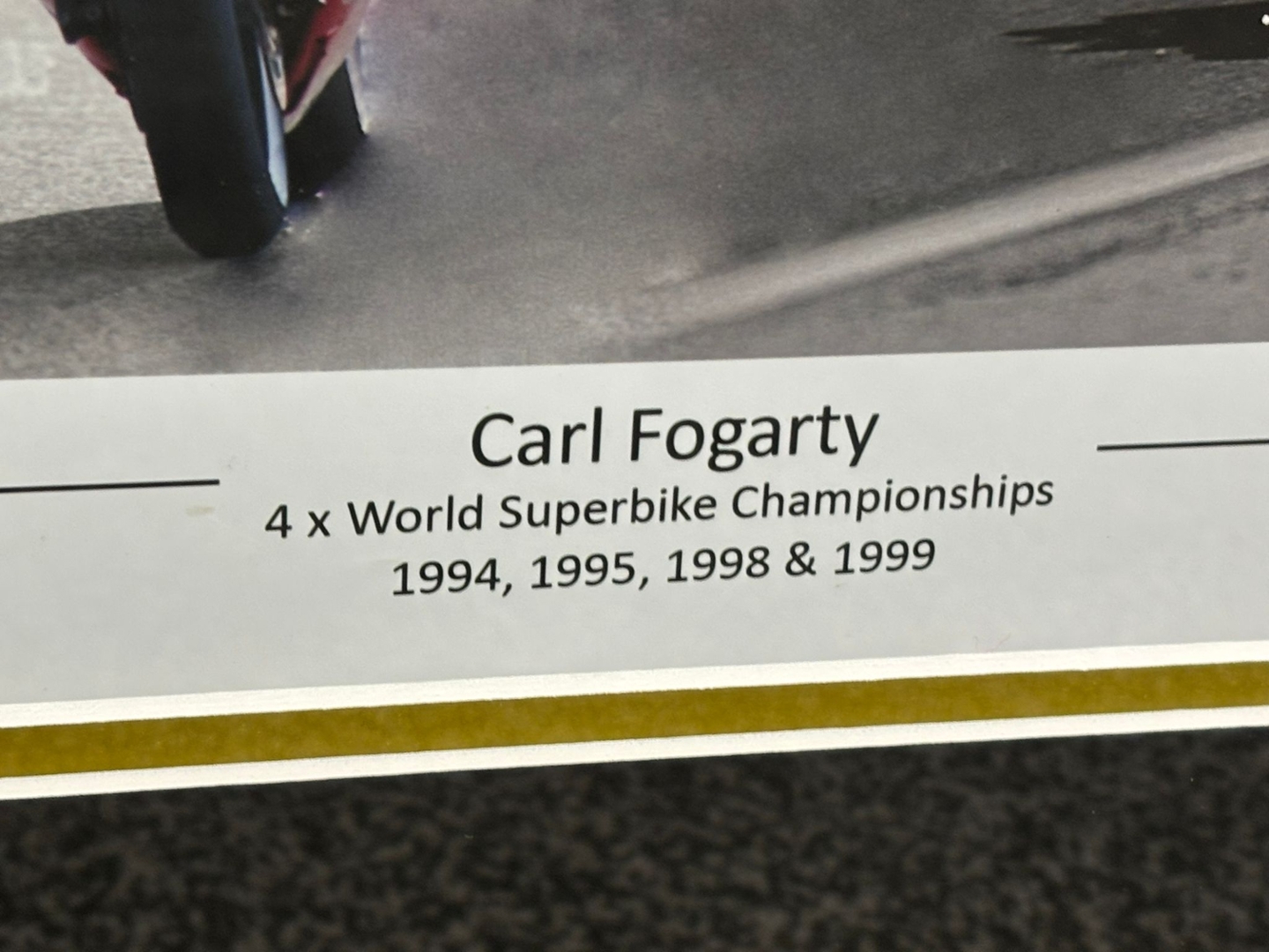A signed and authenticated Carl Fogarty Picture in a presentation frame. Approx 58cm height, 45cm width.