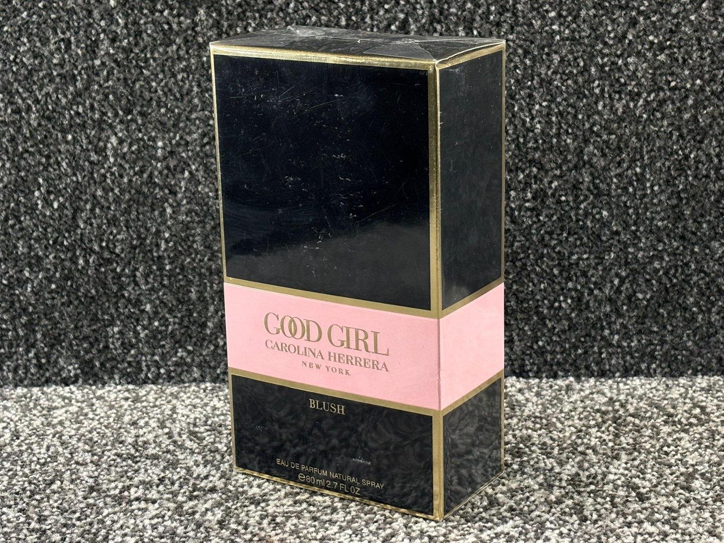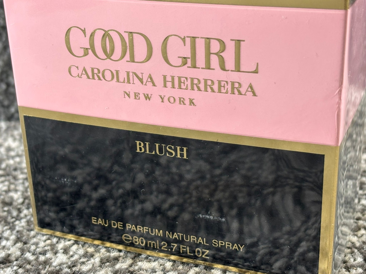 A 80ml bottle of Carolina Herrera Good Girl Blush Eau De Parfum, presented in its original presentation box and offering a softer, more romantic interpretation of the iconic Good Girl fragrance. This elegant edition balances modern femininity with refined confidence, delivering a lighter and more luminous expression of the celebrated line.