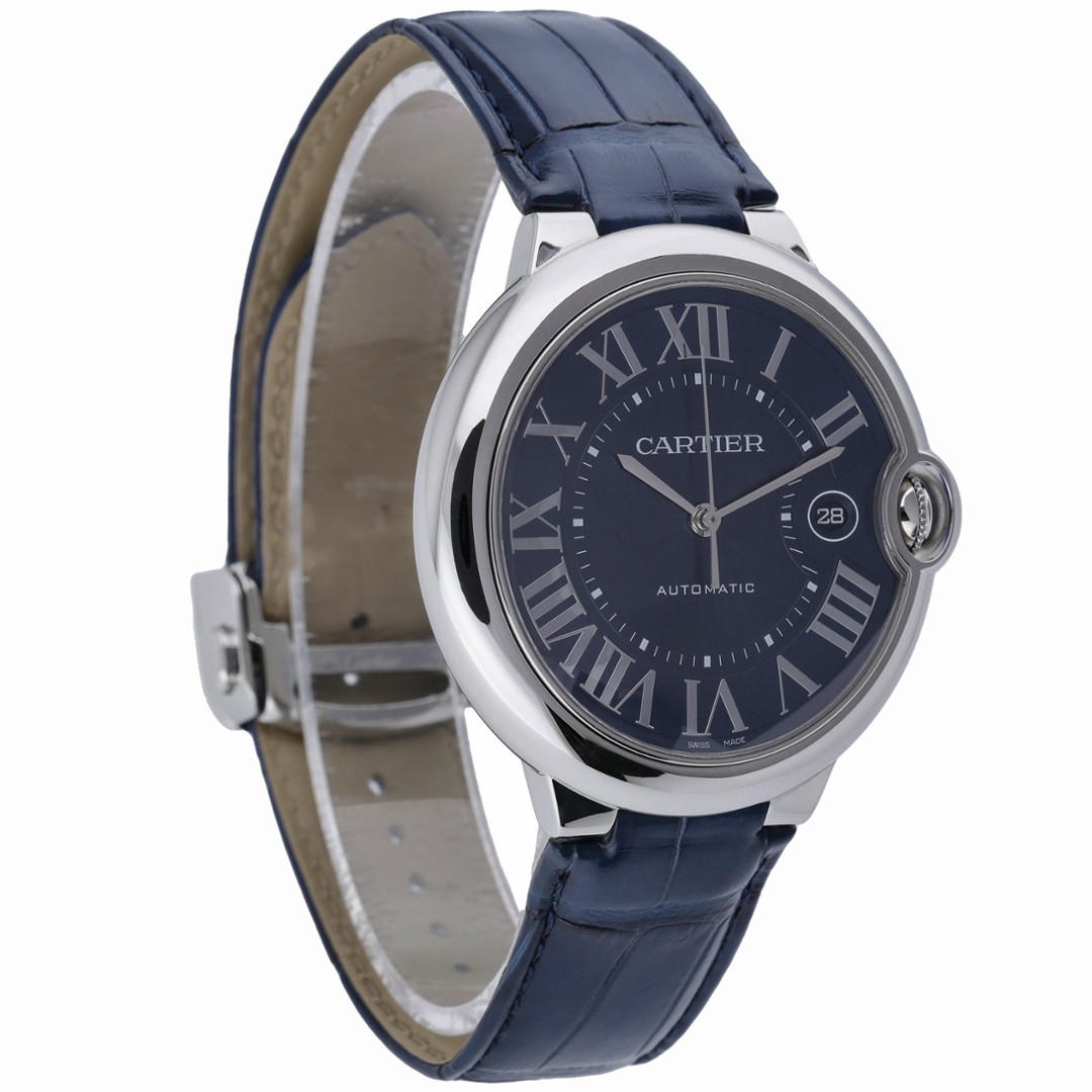 The deep blue dial features Cartier’s iconic oversized Roman numerals, radiating from a guilloché centre that adds depth and texture under light. Sword-shaped hands complement the dial’s symmetry, while the date aperture positioned at 3 o’clock is seamlessly integrated into the design. The monochromatic blue palette delivers a modern, cohesive look while retaining classic Cartier DNA.