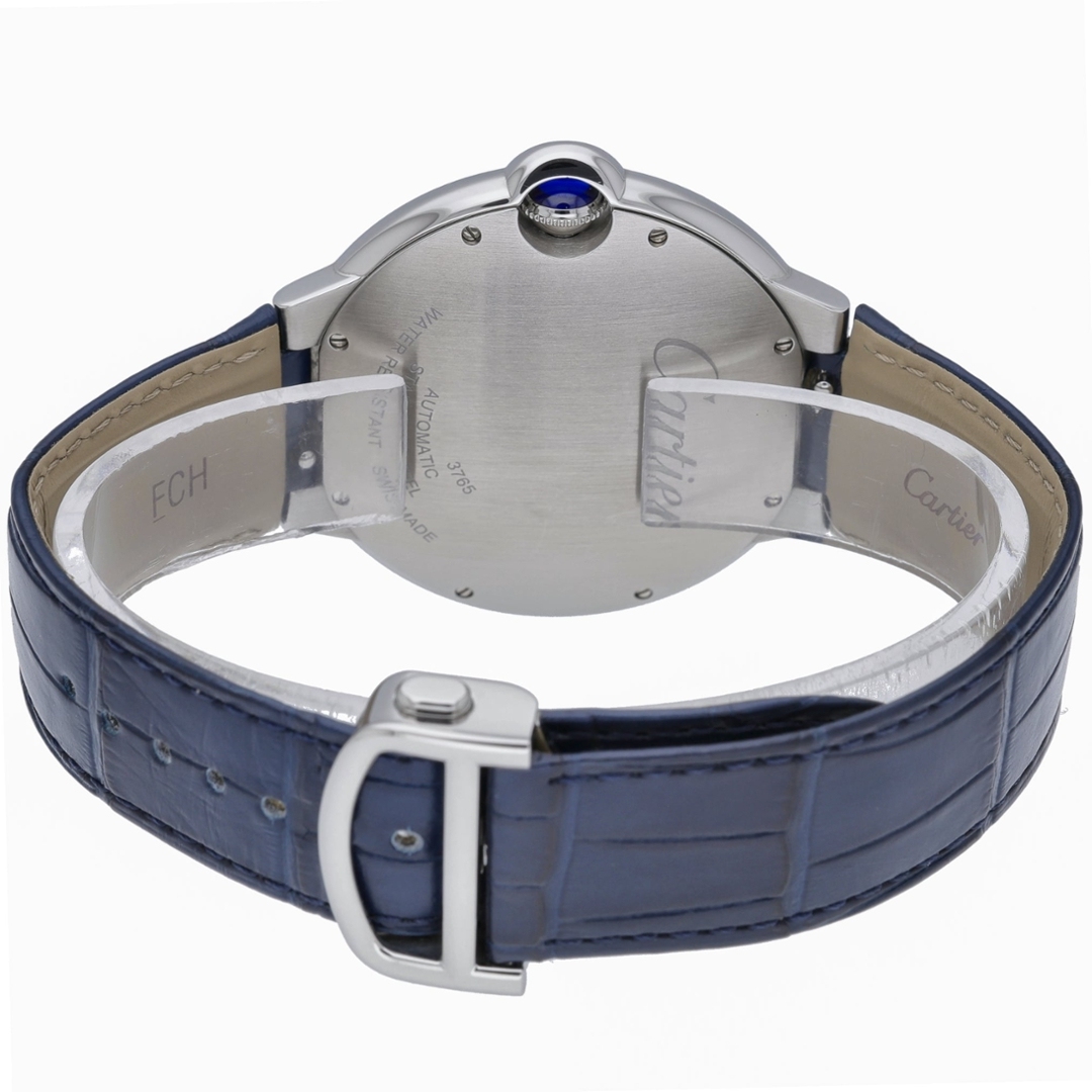 A Cartier Ballon Bleu, reference WSBB0027, presented in stainless steel, showcases the Maison’s signature blend of elegance and fluid design. The rounded case is defined by its distinctive integrated crown guard with blue cabochon detail, while the blue leather strap enhances the refined, contemporary aesthetic. The smooth curves and balanced proportions make this a standout dress piece with strong wrist presence.