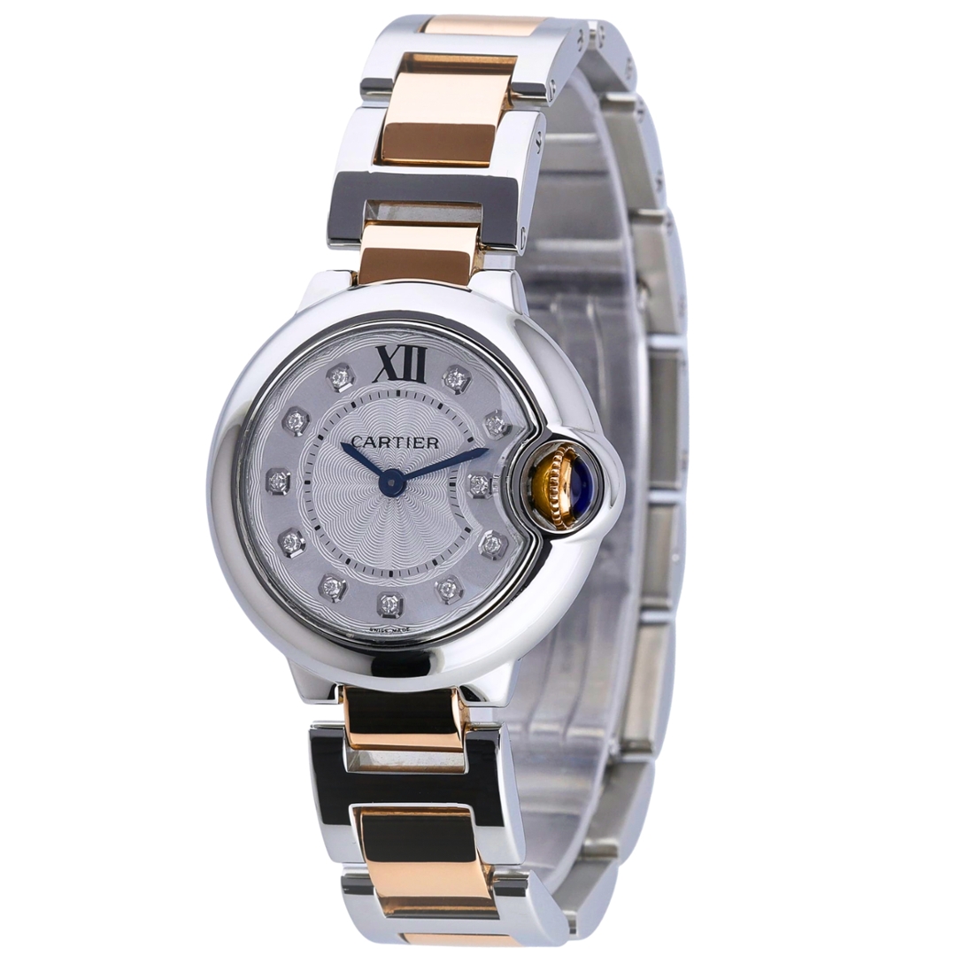 A Cartier Ballon Bleu, presented in a sophisticated bi-metal combination of stainless steel and 18ct rose gold, embodies the refined elegance the collection is known for. The 28mm case frames a silvered dial with a delicate guilloché pattern, elevated by diamond-set hour markers and a Roman numeral at 12 o’clock. Blue steel hands provide a striking contrast, while the signature crown, set with a blue cabochon and seamlessly integrated into the case, defines the unmistakable Ballon Bleu silhouette.