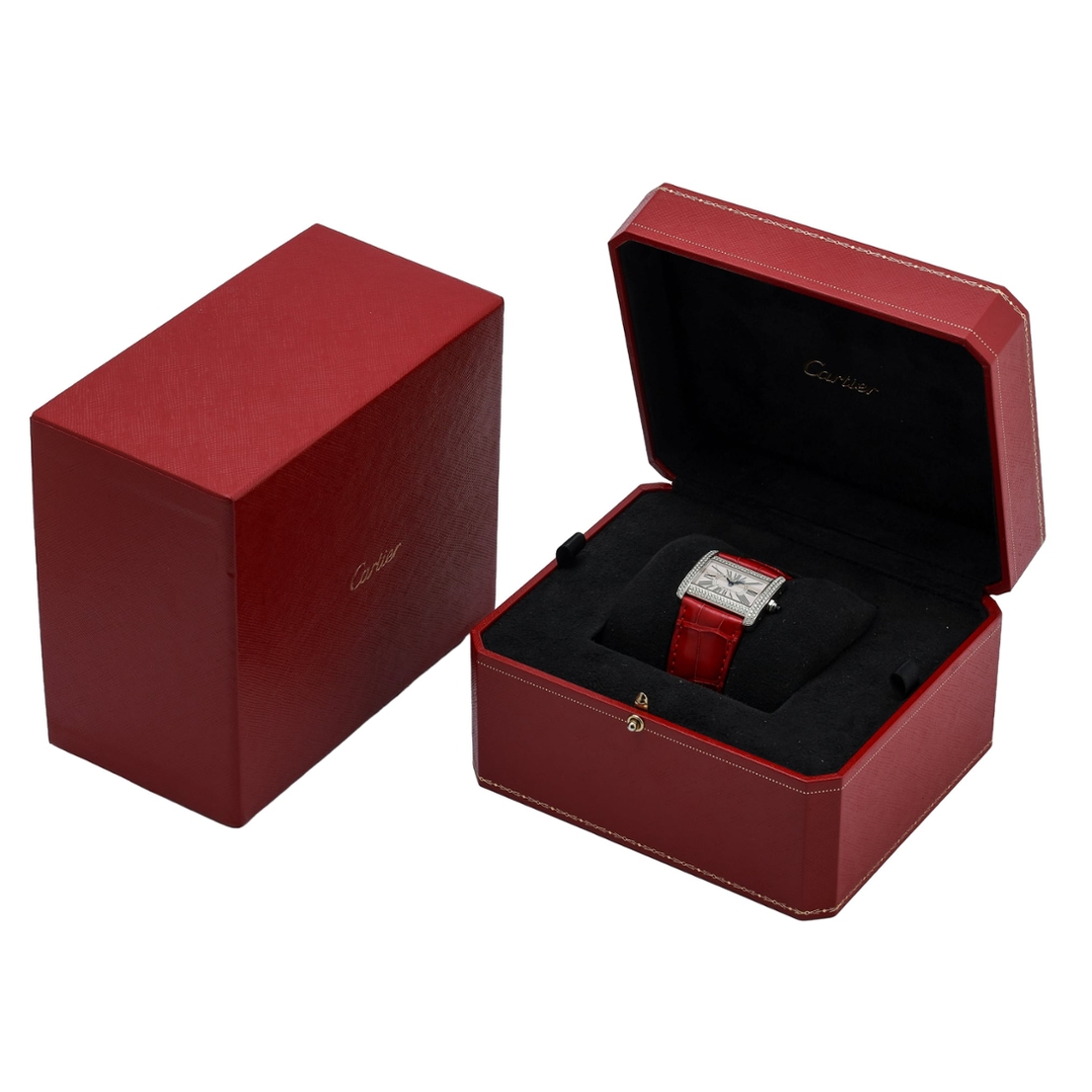 The 32mm rectangular stainless steel case frames a crisp white dial adorned with Cartier’s signature elongated Roman numerals and a refined chemin de fer minute track. Elegant blued steel hands provide a striking contrast against the dial while maintaining excellent legibility. The bezel and side bracelets are set with rows of brilliant-cut diamonds, adding a luxurious jewellery element that enhances the watch’s refined character. Powering the watch is a reliable quartz movement, ensuring precise timekeeping while maintaining the case's slim, balanced proportions.