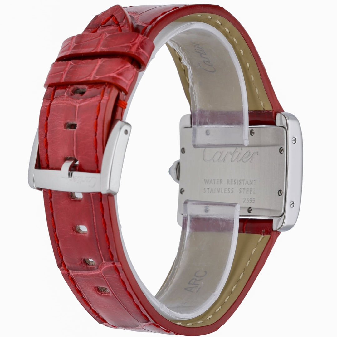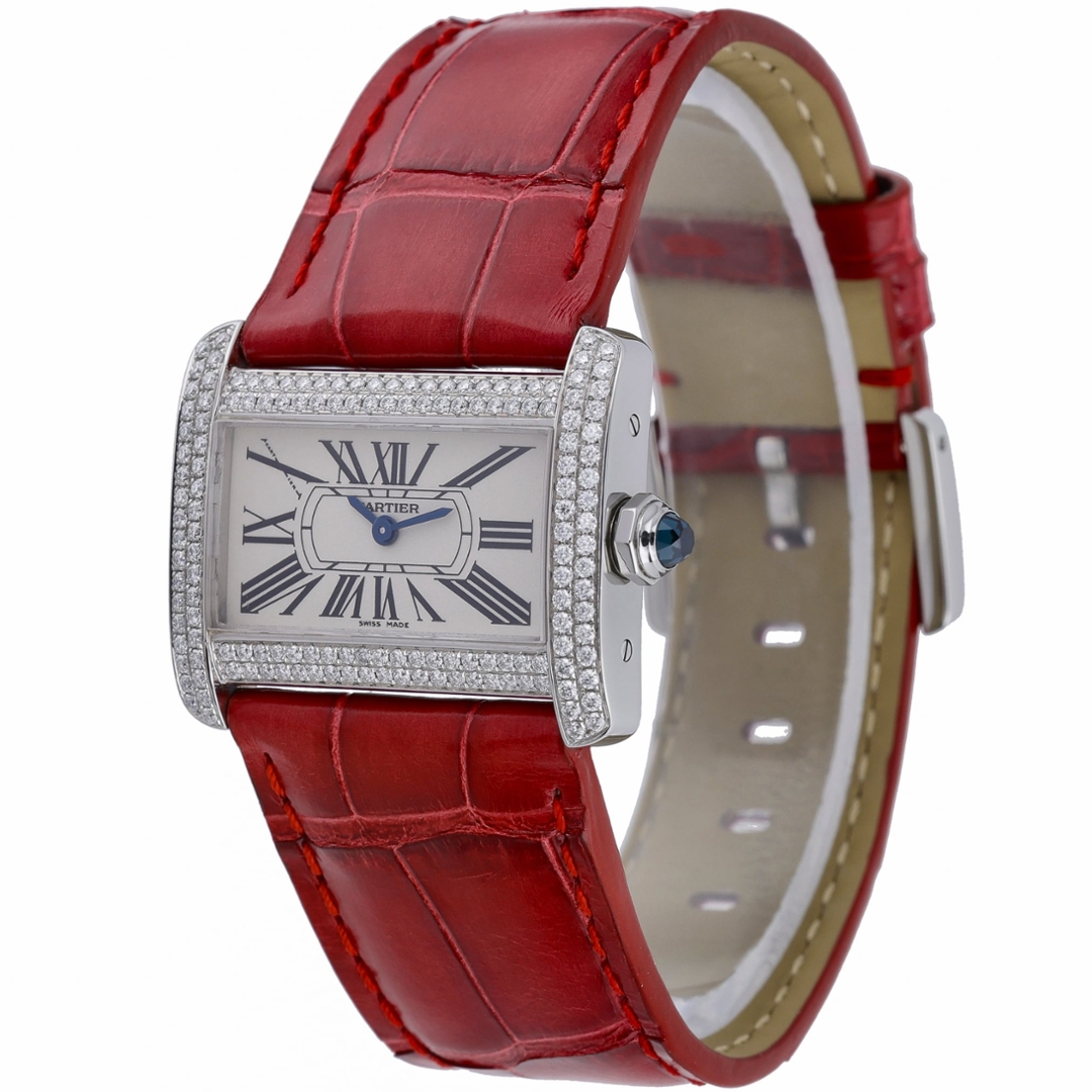 Completing the design is a vibrant red leather strap paired with a stainless steel clasp, creating a striking contrast against the diamond-set case and giving the watch a distinctive and contemporary presence on the wrist. Elegant, stylish, and unmistakably Cartier, the Divan remains a unique addition to the maison’s celebrated watchmaking catalogue.