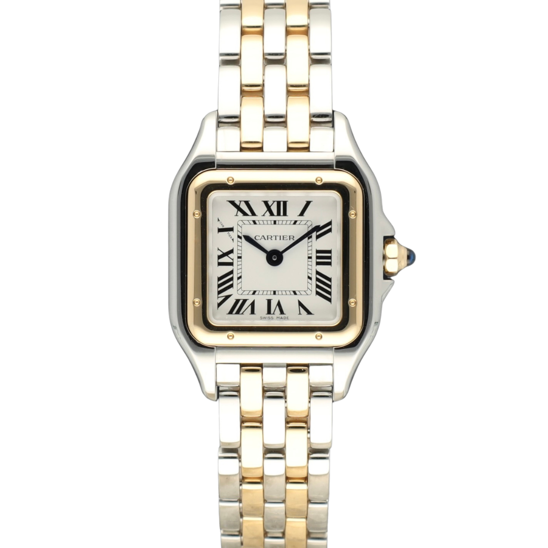 A Cartier Panthère de Cartier reference W2PN0018 in stainless steel and 18ct yellow gold, showcasing the iconic square case with exposed screw-set bezel detailing. The white dial features classic black Roman numerals, a railway minute track, and blued steel hands, all framed within Cartier’s instantly recognisable design language. The integrated bi-metal bracelet enhances the watch’s jewellery-inspired aesthetic, offering a seamless, refined wrist presence in a versatile 23mm x 30mm case.