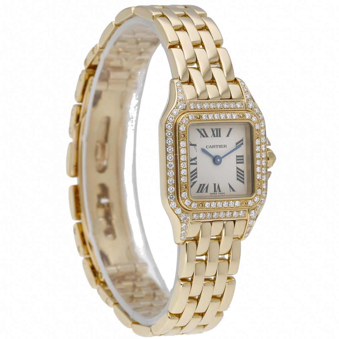 A Cartier Panthère watch crafted entirely from solid 18ct yellow gold, featuring an elegant white dial and a dazzling afterset diamond bezel that adds a touch of brilliance to this iconic design. Model number 1280, this 2001 example is powered by a precise automatic movement, combining Cartier’s timeless aesthetic with dependable performance. The 22mm case embodies the refined proportions and graceful curves that define the Panthère collection—one of the most enduring symbols of luxury and sophistication in Cartier’s history.