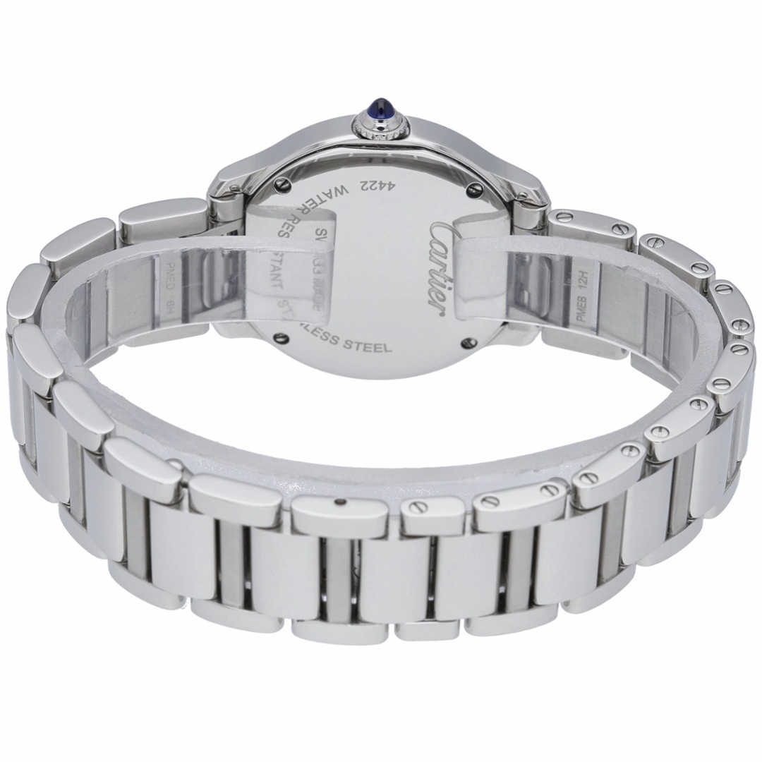 A Cartier Ronde Solo watch, reference WSRN0033, crafted in stainless steel and presented on a matching Cartier bracelet. The elegant 29mm round case embodies Cartier’s refined design language, featuring smooth, flowing lines and the maison’s signature sapphire cabochon crown. The silvered dial features bold black Roman numerals, a delicate railway minute track, and striking blued-steel sword hands, delivering the timeless aesthetic that has defined Cartier dress watches for generations.