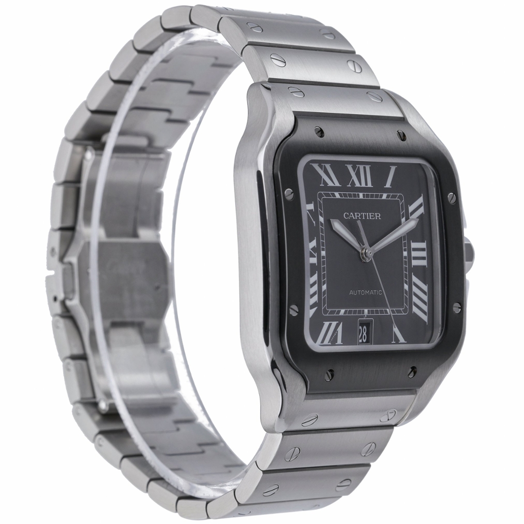 A Cartier Santos De Cartier Watch, Stainless Steel with a Black Bezel and a Grey Dial.