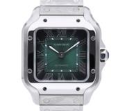 The Cartier Santos de Cartier Watch features a classic square case silhouette, measuring 39mm in diameter, and exudes a bold and confident presence on the wrist. The stainless steel construction offers durability and understated luxury, while the black bezel adds a touch of modernity and contrast to the design. The grey dial provides a clean and sophisticated backdrop for the watch's signature Roman numeral markers and blue sword-shaped hands.