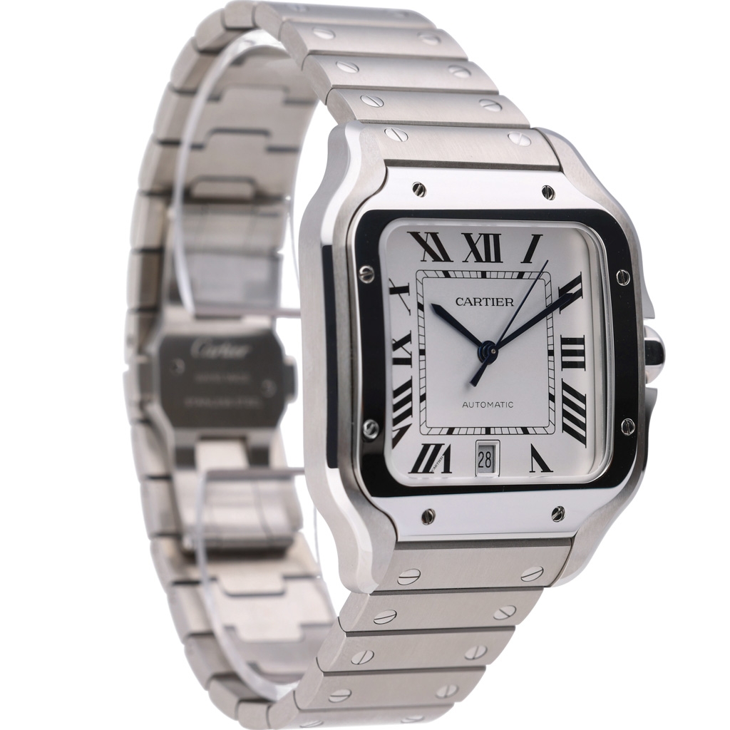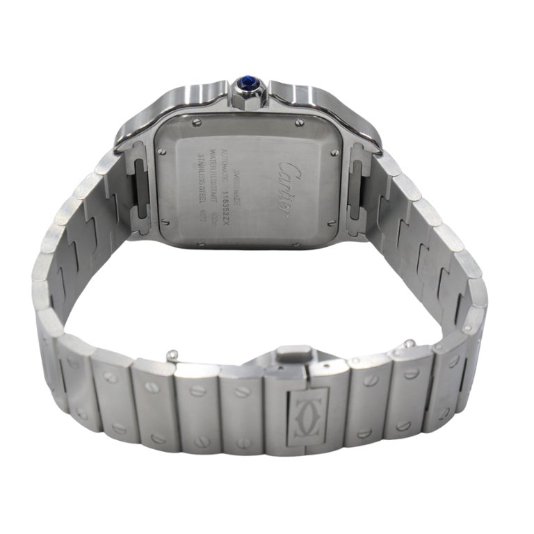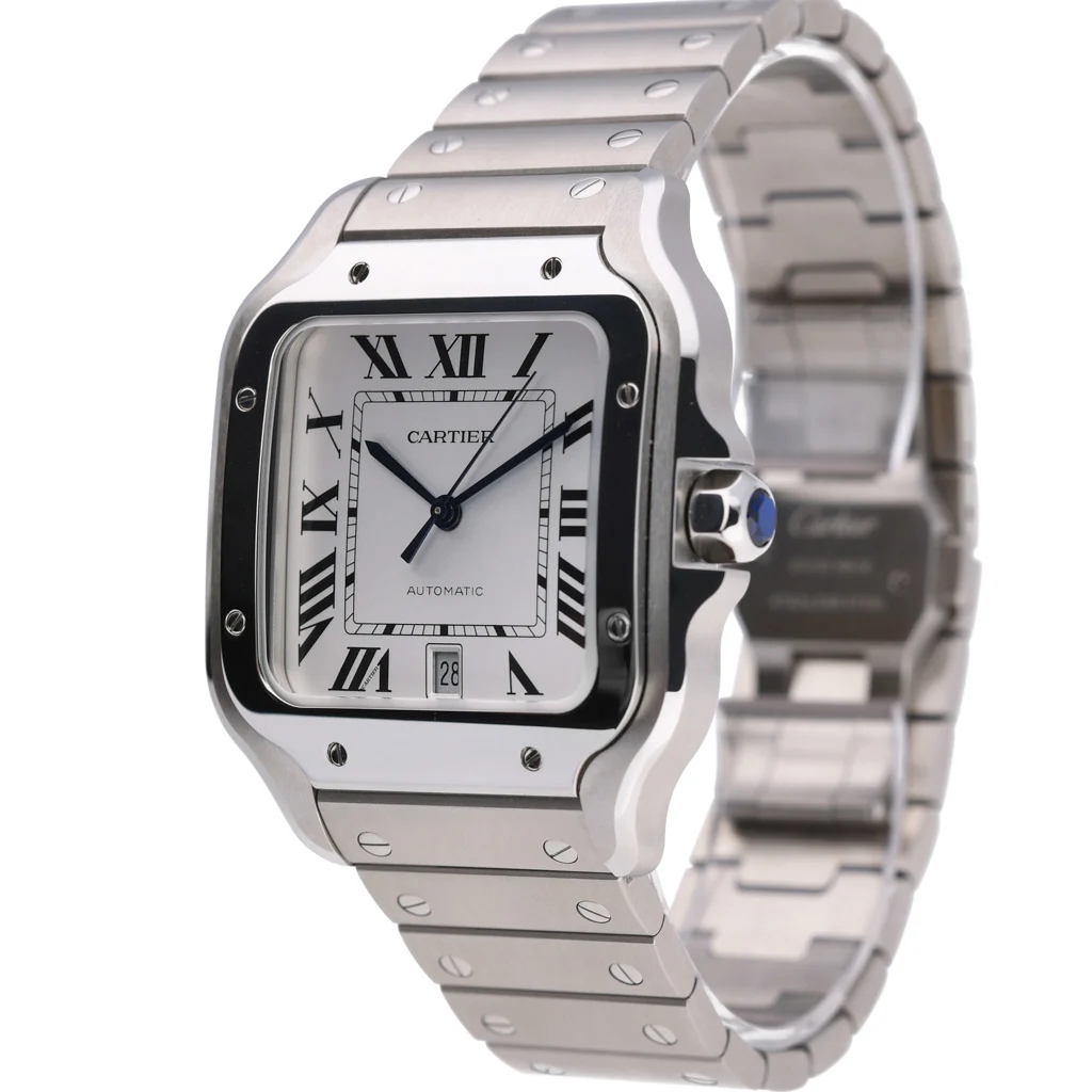 A Cartier Santos Large Watch, masterfully crafted in stainless steel, exemplifies the maison’s timeless elegance and innovation. Featuring a distinctive square 39.8mm case with softly curved lugs and a signature seven-sided crown set with a faceted synthetic spinel, this model pays homage to the pioneering spirit of Alberto Santos-Dumont.