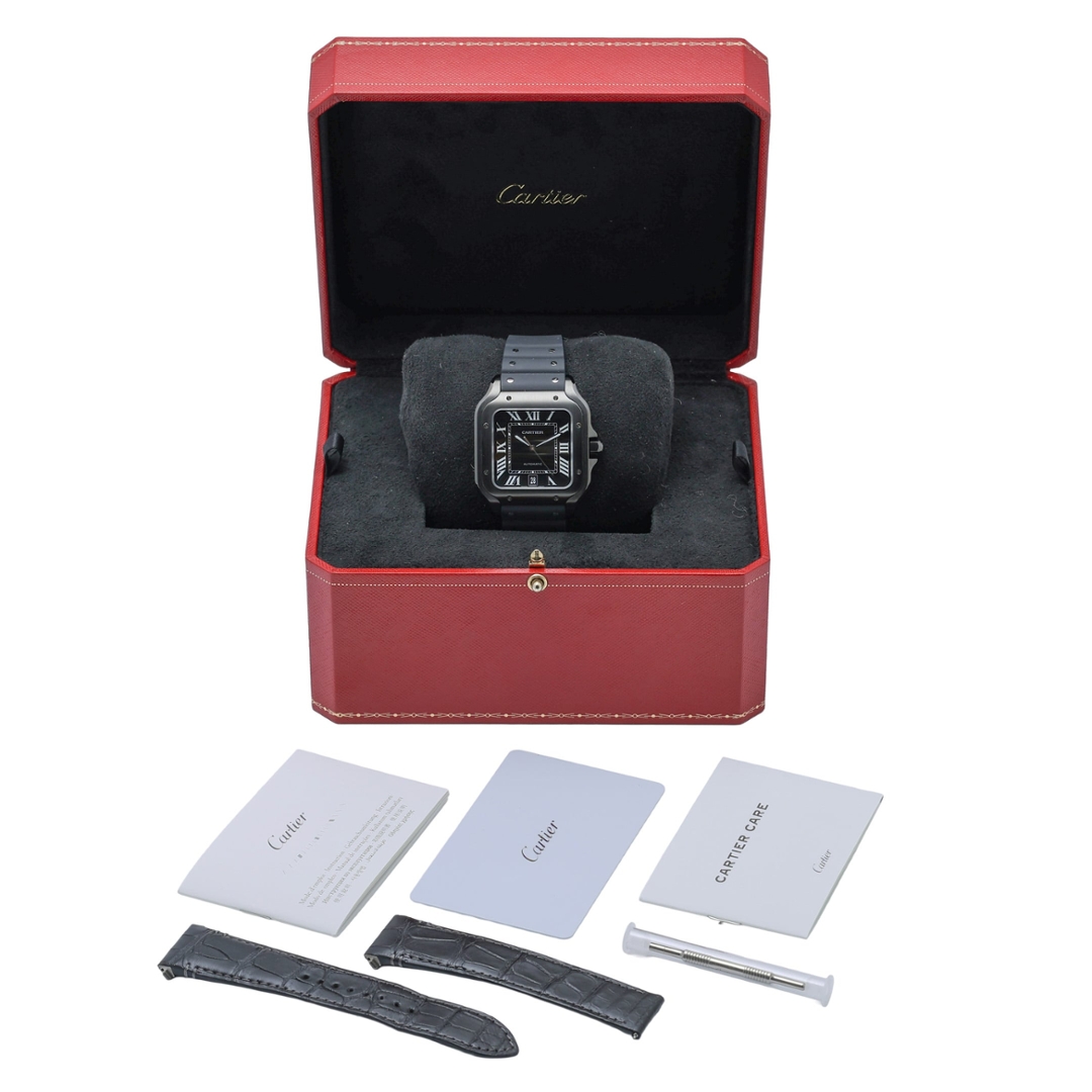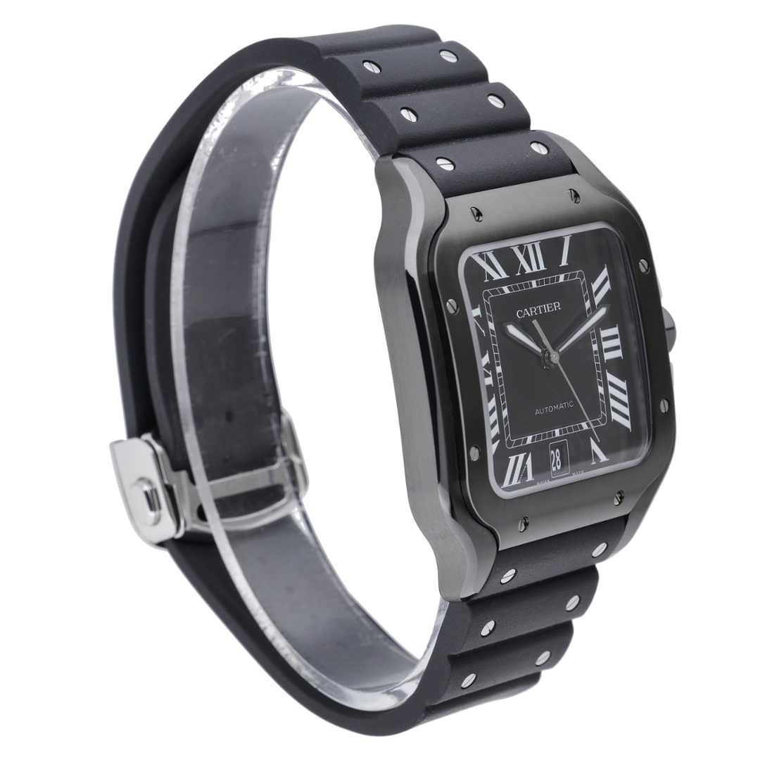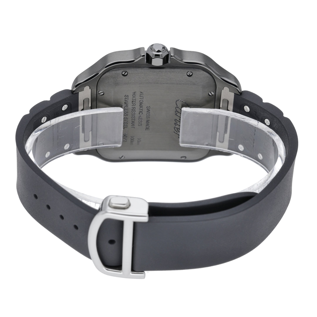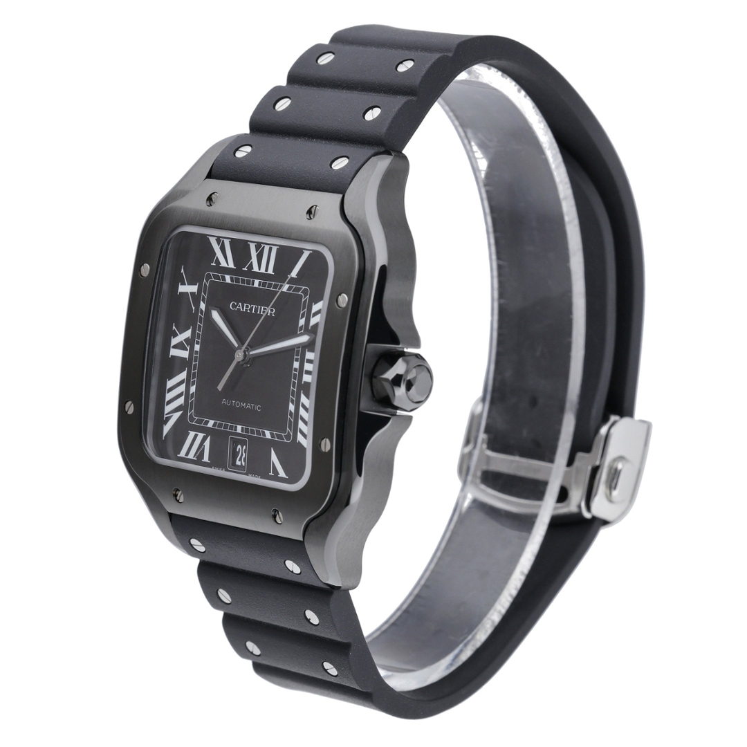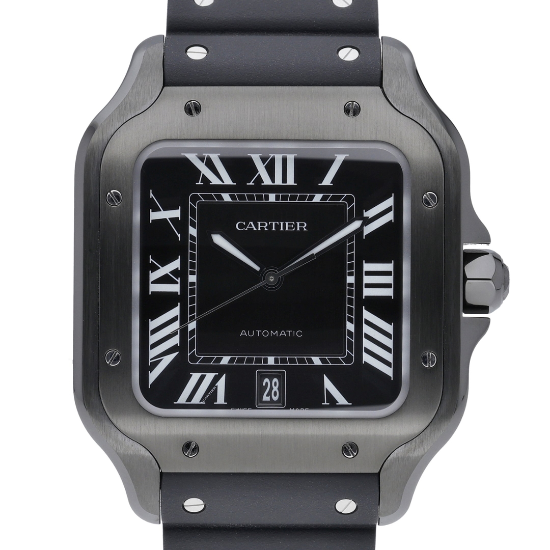 A Cartier Santos Watch, Black Rubber Strap with a Steel Case and Clasp with an ADLC-Coated Steel Bezel on a Black Dial.