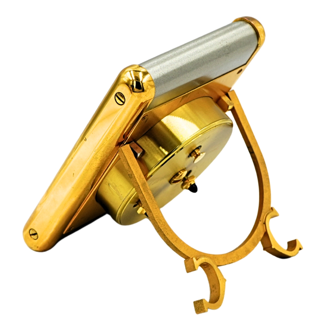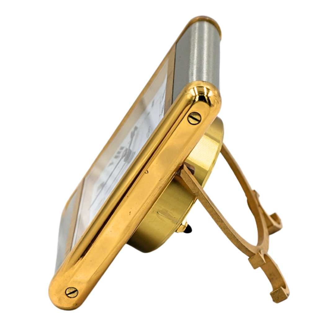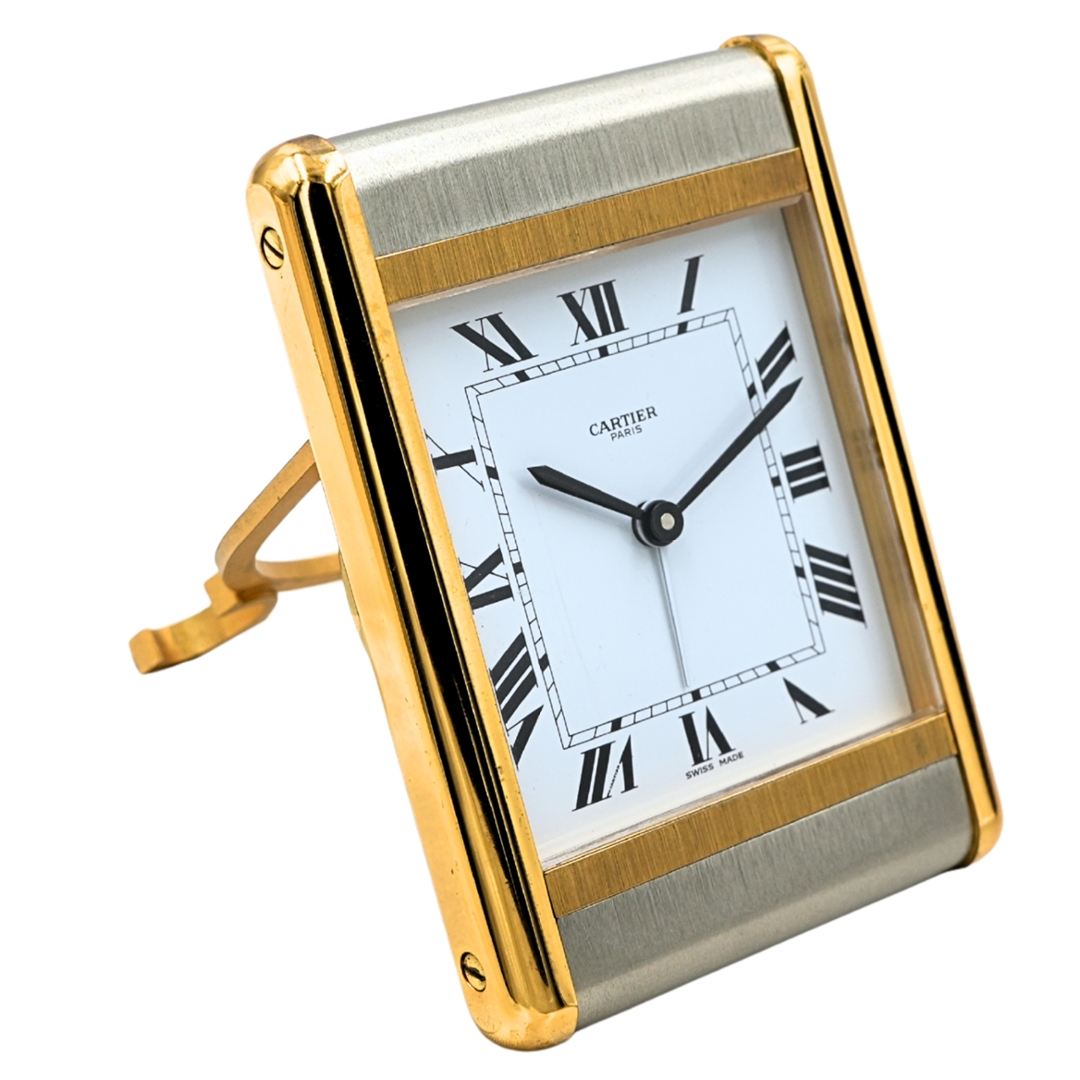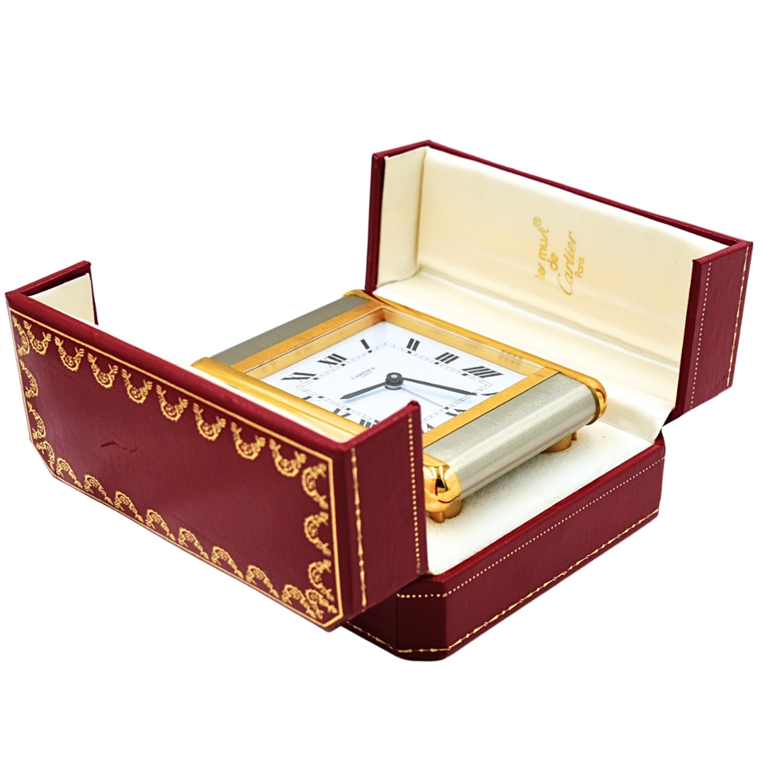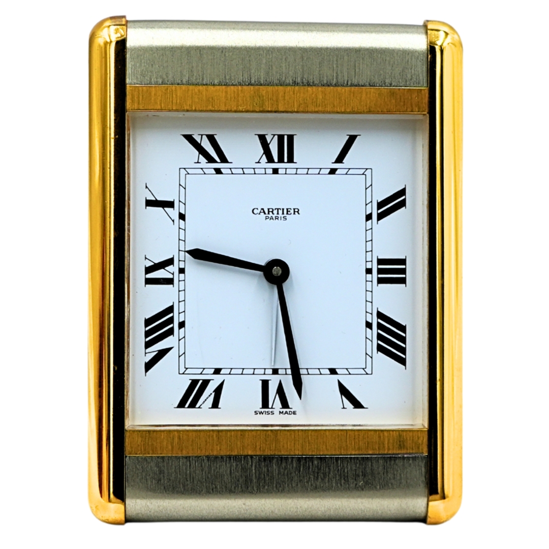 A Cartier Tank two-tone alarm clock is a refined, highly collectable desk piece that draws directly on the iconic Tank watch design language. Finished in a combination of brushed and gilt-toned surfaces, the rectangular case frames a crisp white dial with bold Roman numerals and classic blued hands. Its proportions and detailing give it immediate visual authority, making it equally suited to a desk, bedside, or display cabinet.