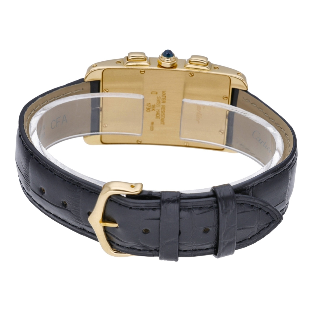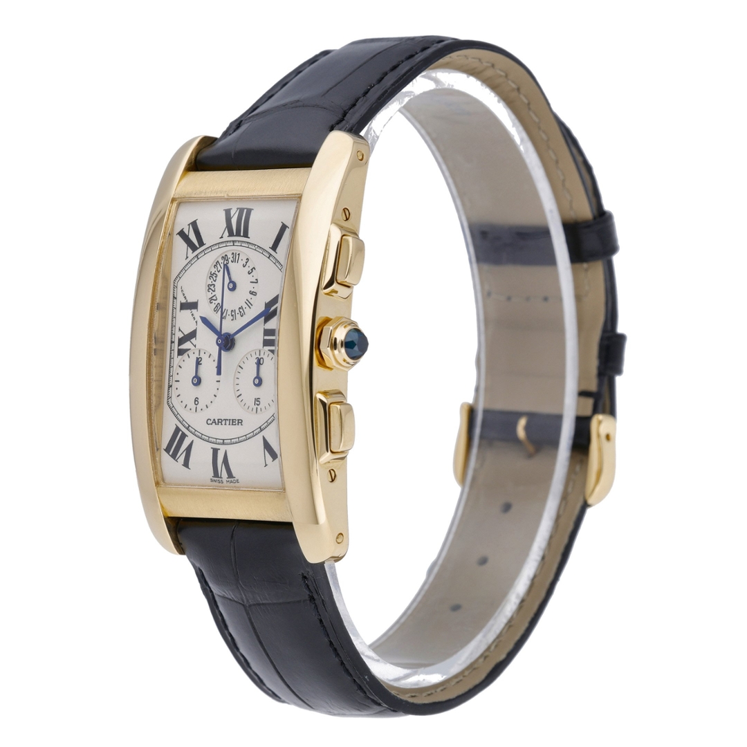 A Cartier Tank Américaine, reference 1730, is an elegant expression of Cartier’s signature rectangular design — elongated, refined, and instantly recognisable. This 18ct yellow gold example is paired with a classic black leather strap and a matching gold Cartier deployant clasp, giving the watch a sophisticated, timeless presence on the wrist. The white dial features bold black Roman numerals, blued-steel hands, and a beautifully executed triple-register chronograph layout with a pointer date — exactly as shown in your images, confirming a correct dial and complication match for this model.