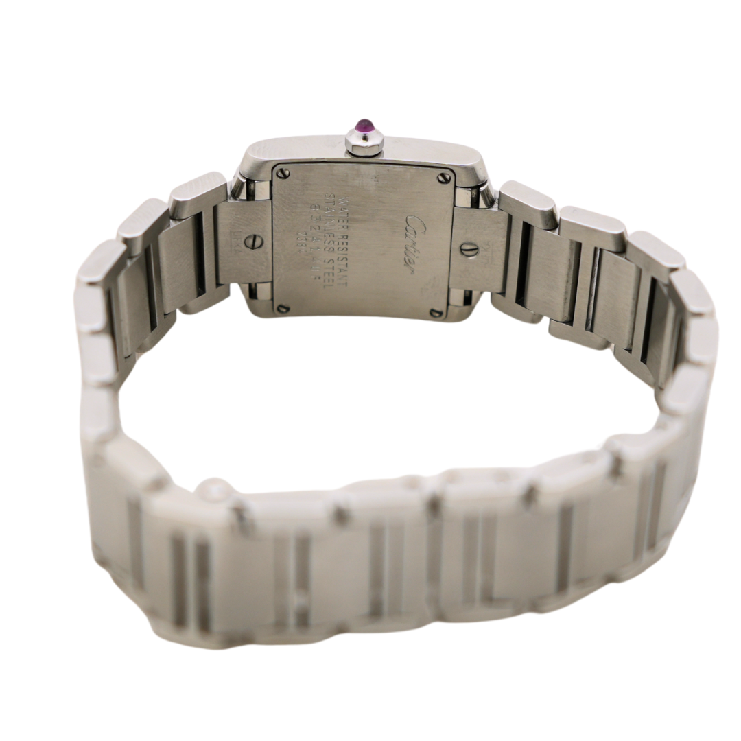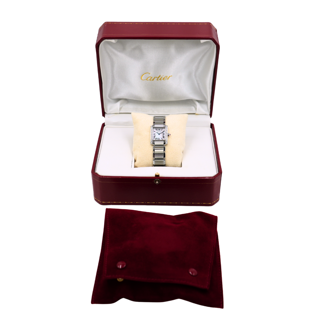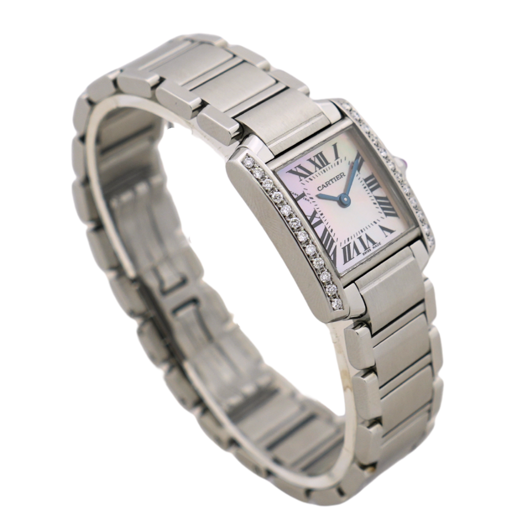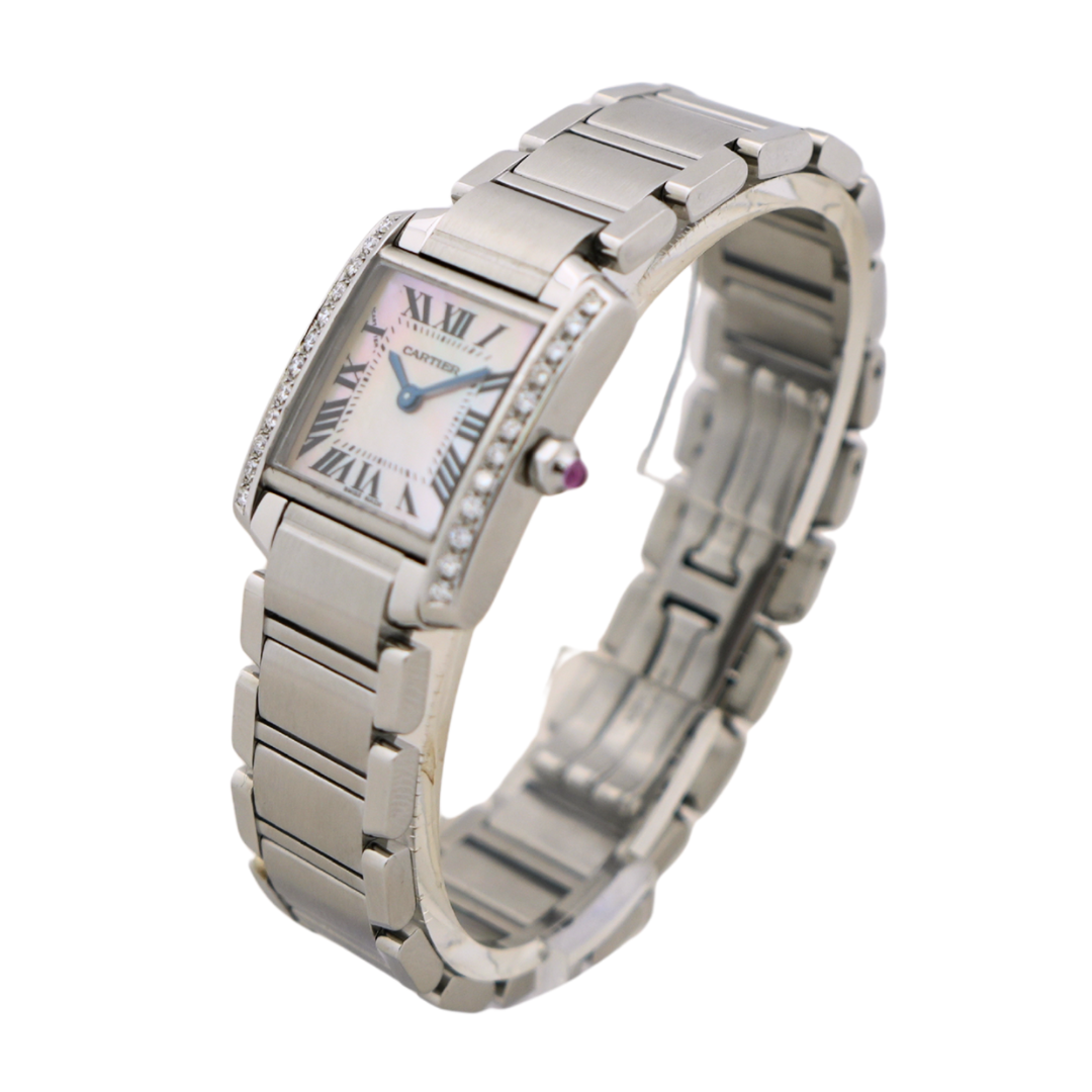 A Cartier Tank Française Watch, model 2364, crafted in stainless steel and elegantly enhanced with a Cartier factory-set diamond bezel. This petite 20mm model features a soft pink mother-of-pearl dial that radiates femininity and charm, while the precise quartz movement ensures reliable, low-maintenance timekeeping.