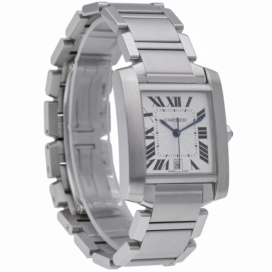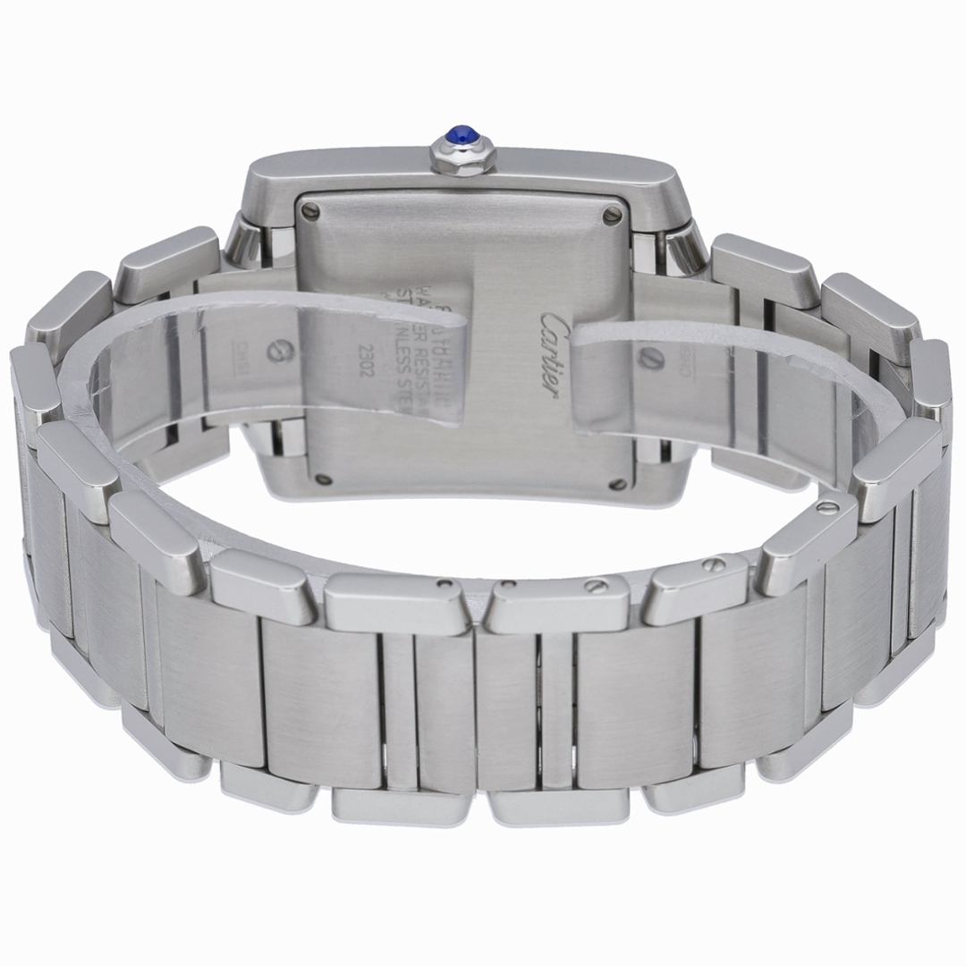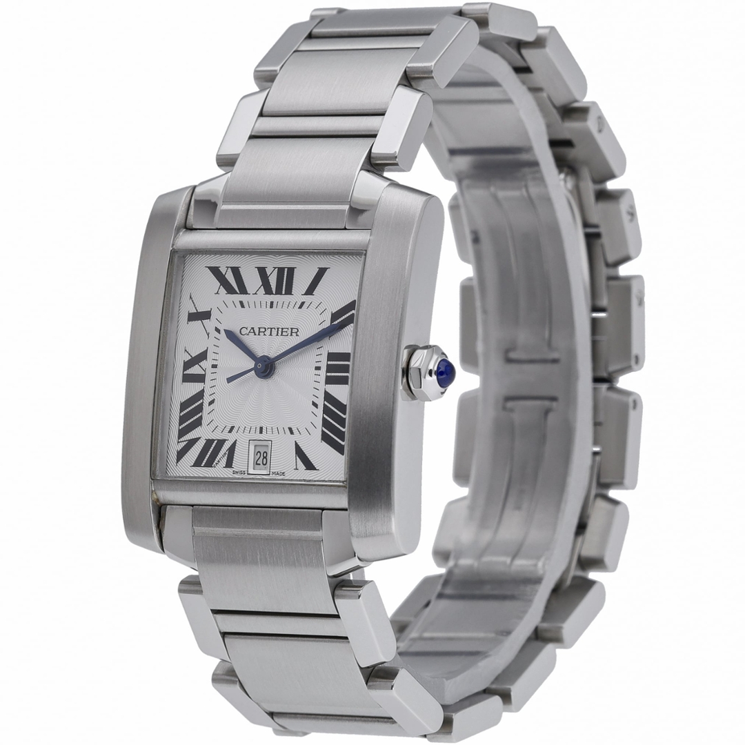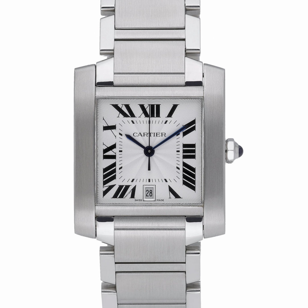 A Cartier Tank Française watch, model 2302, crafted in stainless steel and presented on its integrated steel bracelet. The 28mm case retains the collection’s instantly recognisable rectangular profile, defined by clean lines and a seamless flow into the bracelet. The silvered white dial features bold black Roman numerals, a railway minute track and a date aperture at 6 o’clock, all complemented by Cartier’s signature blued steel hands and cabochon-set crown.