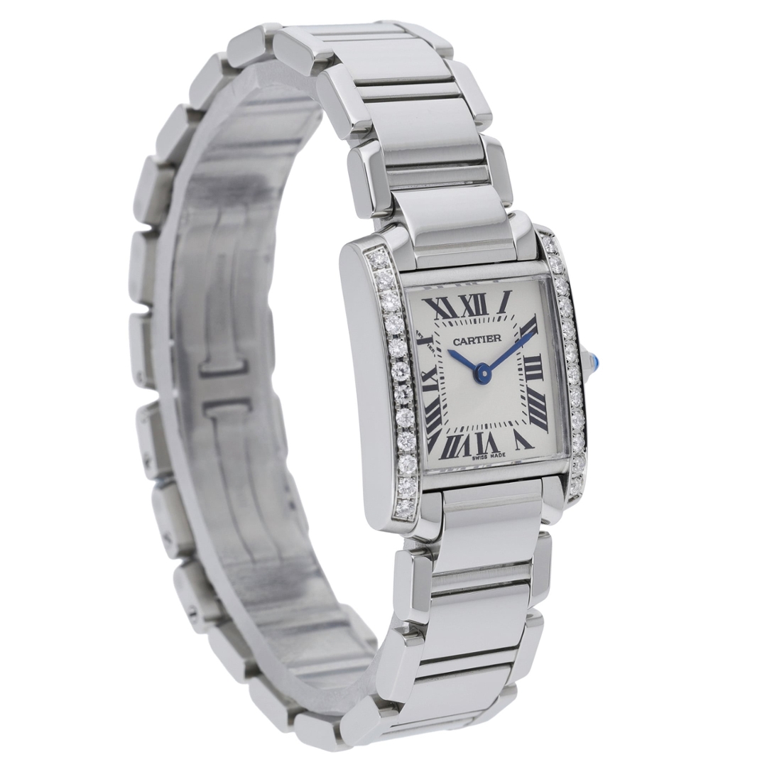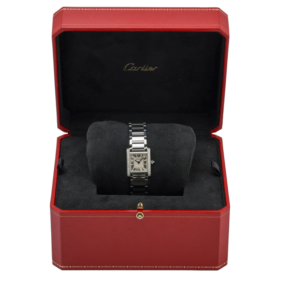 A Cartier Tank Francaise Watch, Stainless Steel with a Diamond Bezel on a White Dial