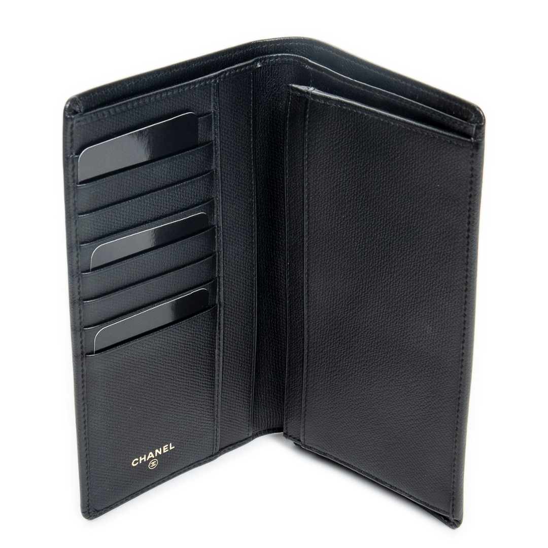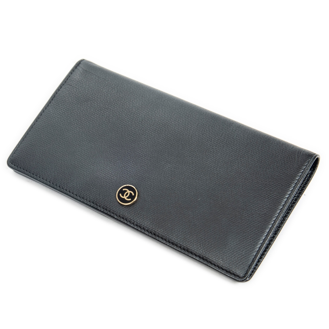 A vintage Chanel black calf leather CC Button Long Flap Wallet with a certificate of authenticity, Approximately 10cm height, 18cm width.