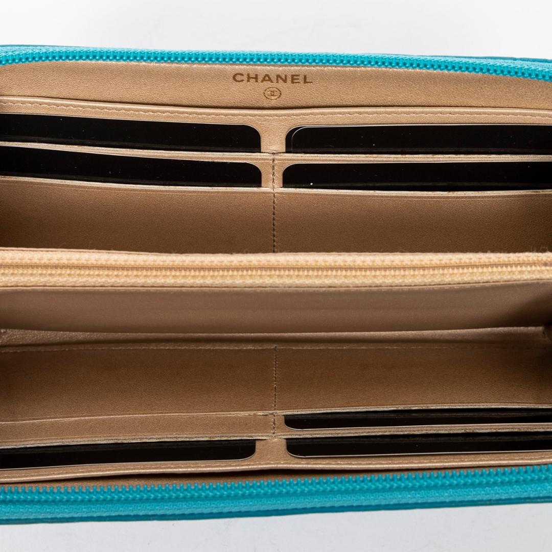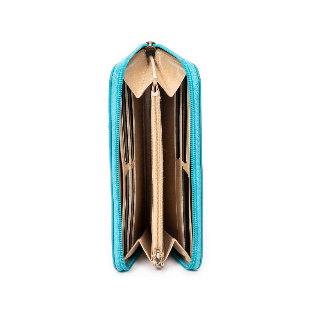 Measuring approximately 10cm in height and 19cm in width, this wallet combines practicality with iconic style. The zip-around closure ensures security, while the interior offers multiple compartments for cards, notes, and coins, designed with Chanel’s signature attention to detail. Its vibrant teal hue makes it a statement accessory, bringing a refreshing pop of color to any ensemble.