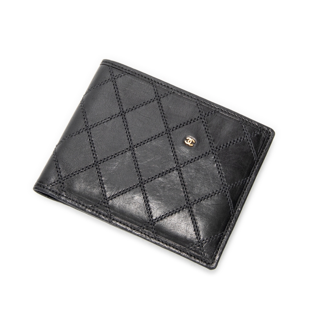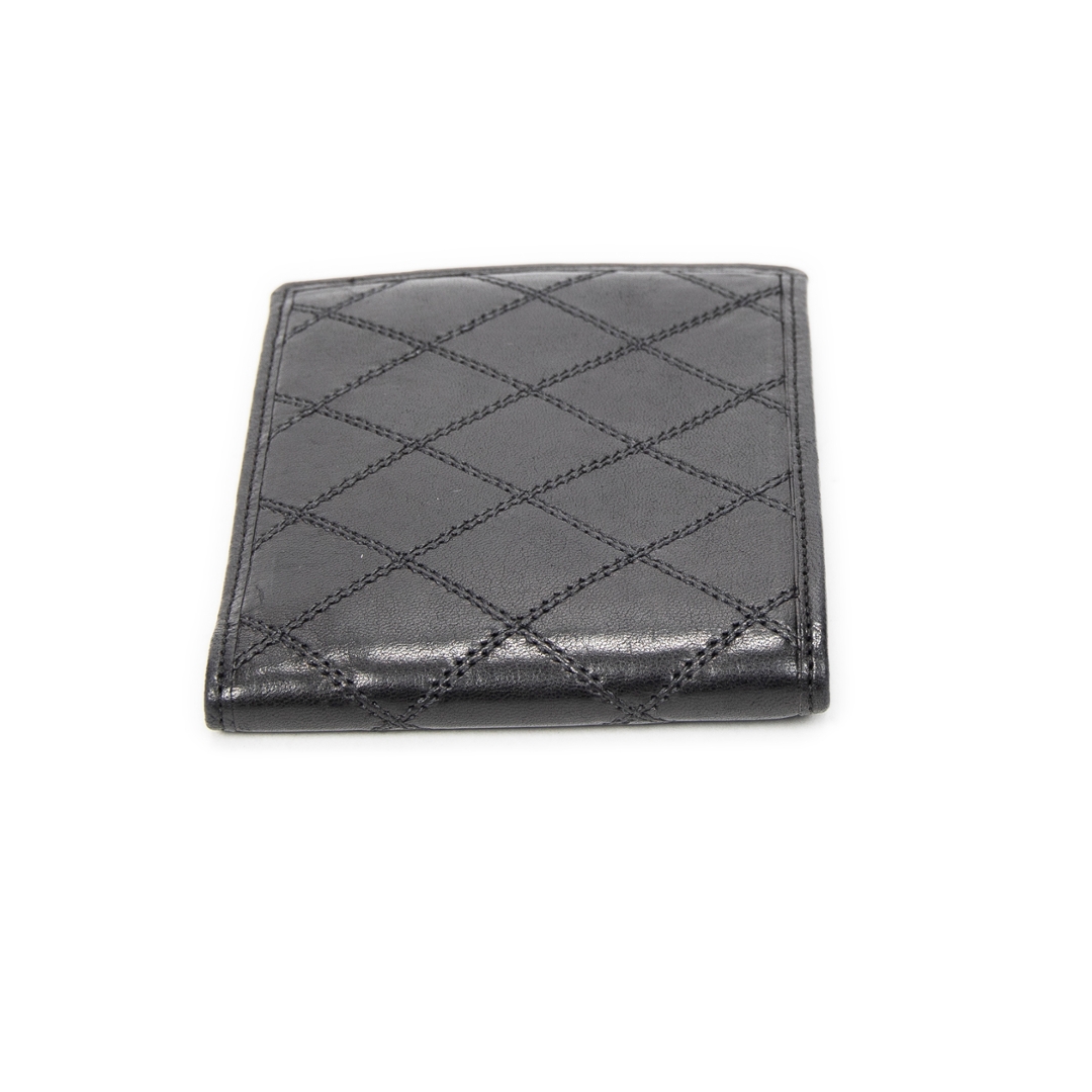 A vintage Chanel black quilted lambskin leather CC Compact Bifold Wallet with a certificate of authenticity, Approximately 9cm height, 11cm width.