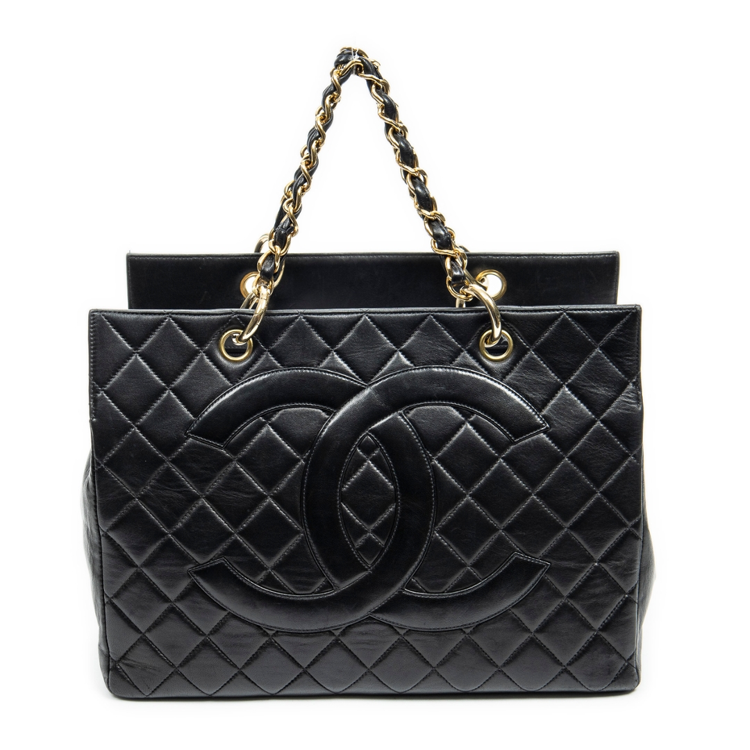 A black vintage calf leather Chanel CC Grand Shopping Tote bag with a certificate of authenticity, Approximately 24cm height, 32.5cm width.