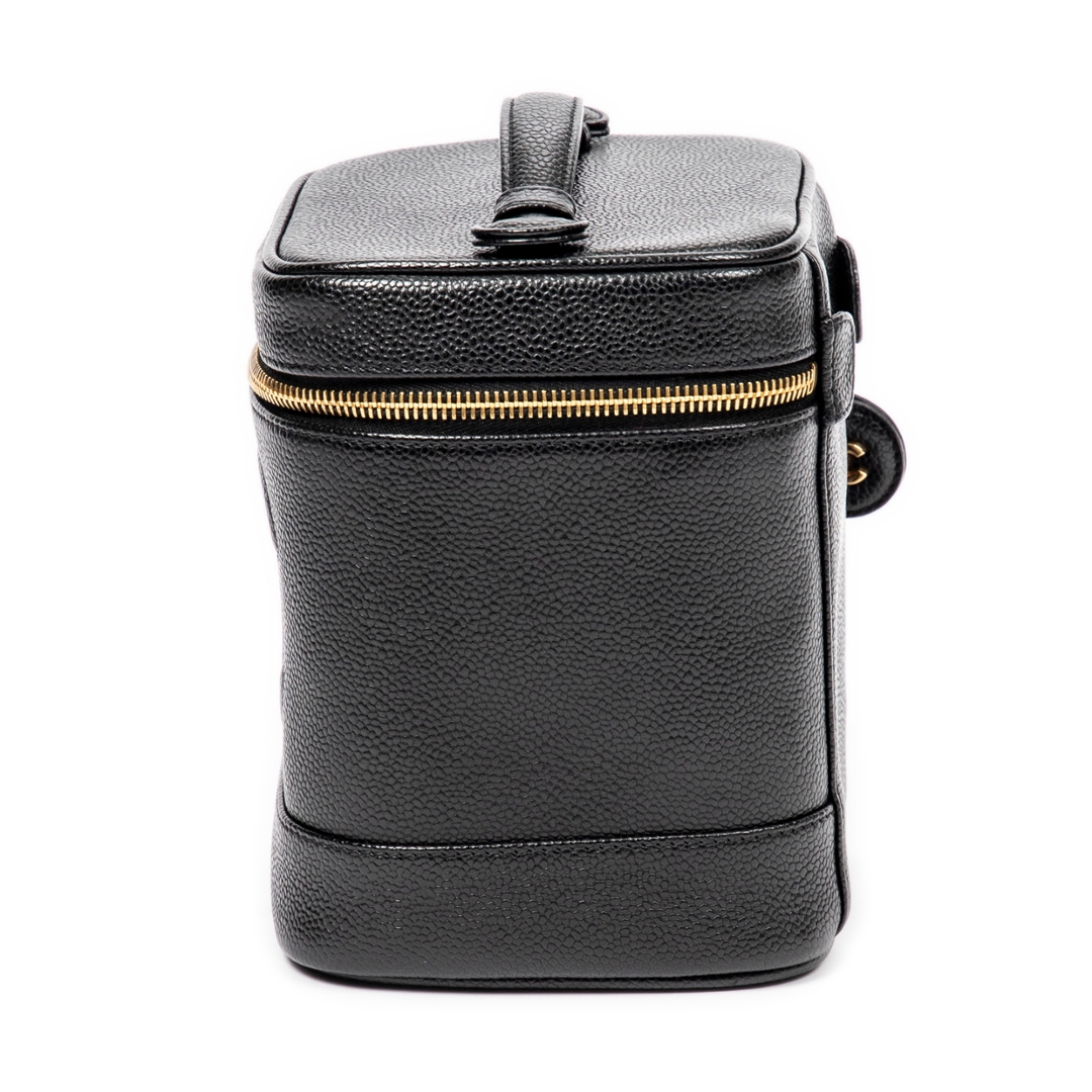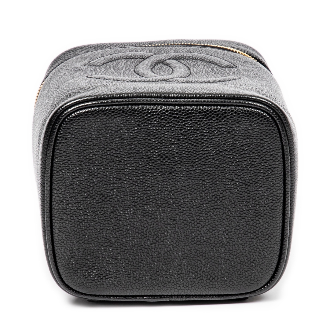A vintage Chanel black calf leather CC Tall Vanity Case bag with a certificate of authenticity, Approximately 17cm height, 15cm width.