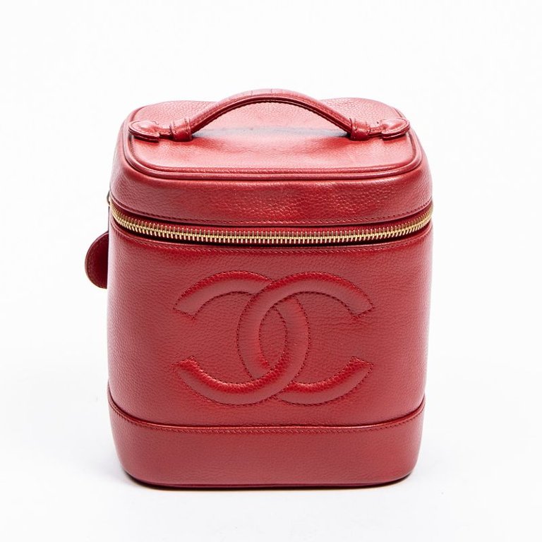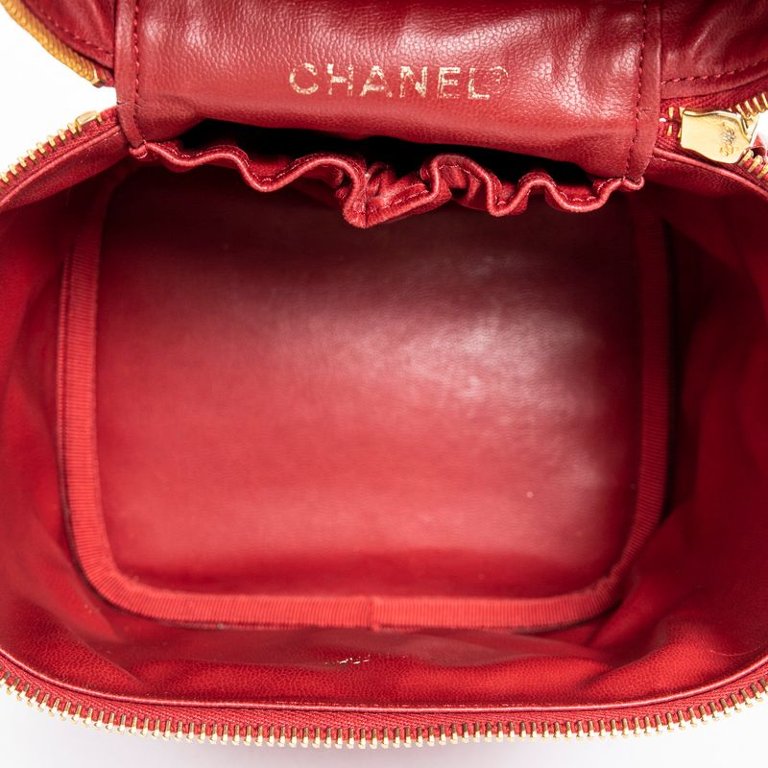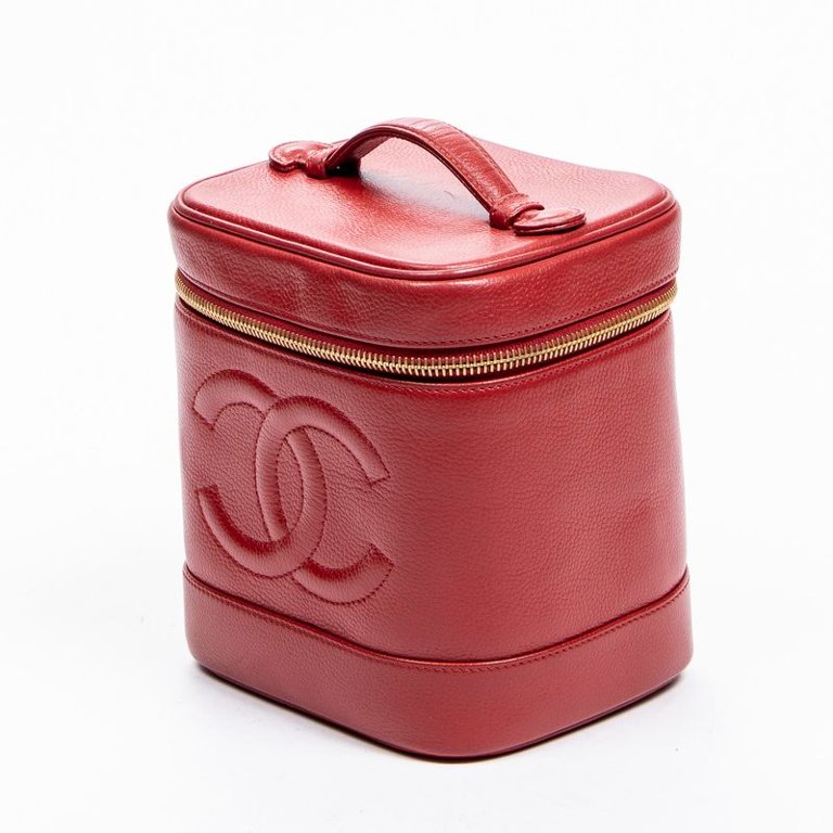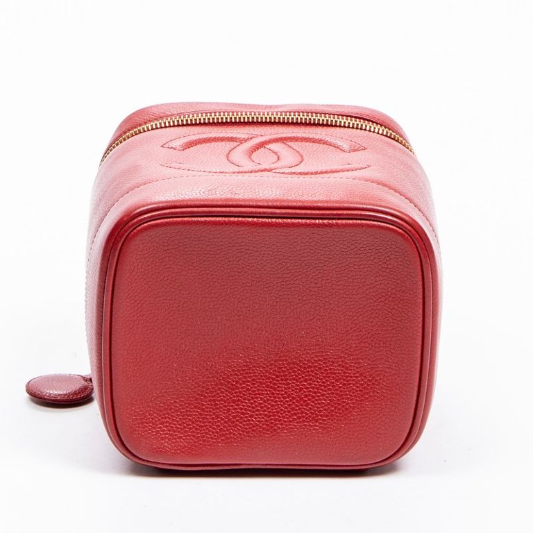 A vintage Chanel red calf leather CC Vanity Case with a certificate of authenticity, Approx 16cm height, 15cm width.