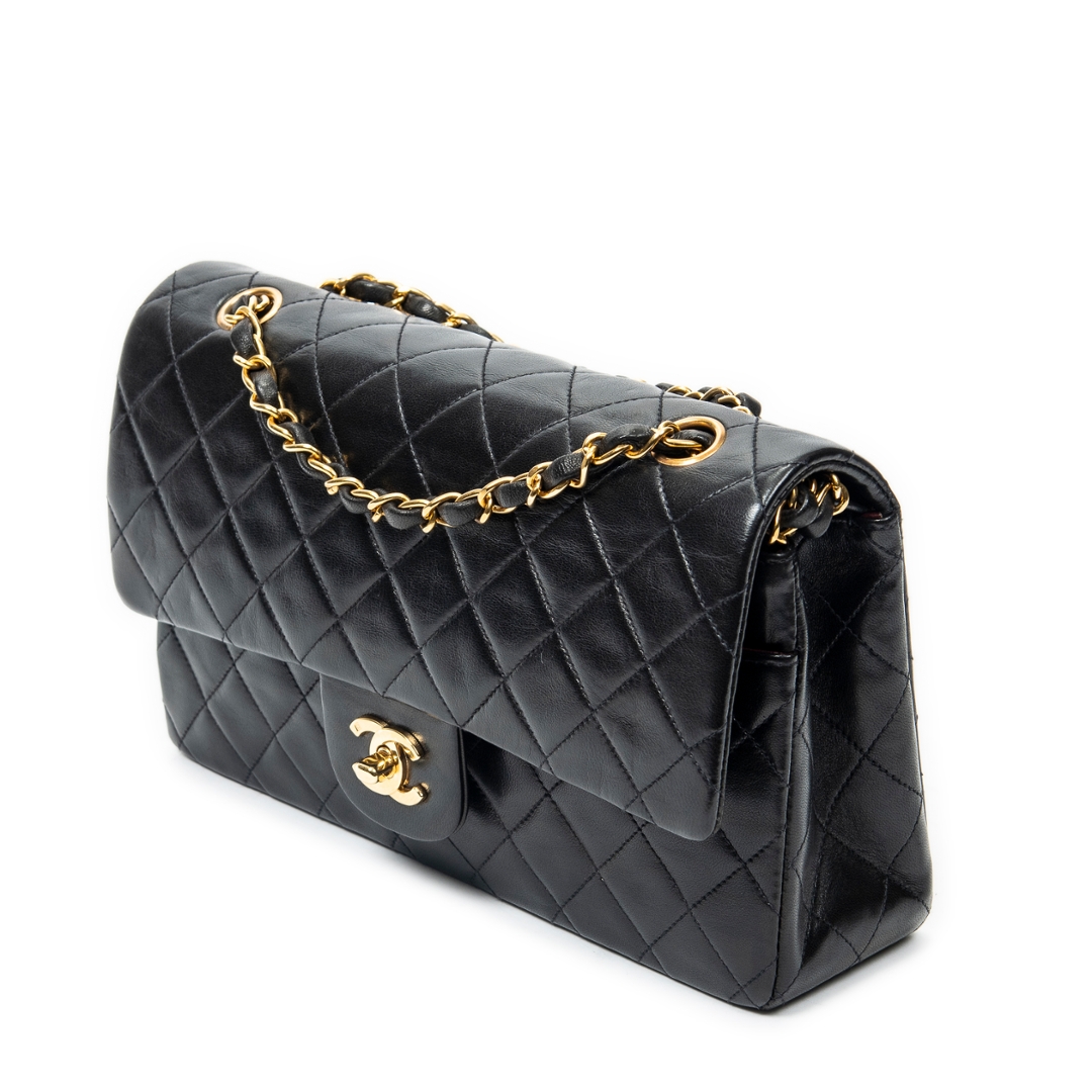 A vintage Chanel black quilted lambskin leather Classic Double Flap bag, capturing the essence of timeless Chanel design. Crafted from soft lambskin, the signature diamond quilting enhances both structure and texture, while the gold-tone CC turn-lock closure and leather-threaded chain strap create a refined and instantly recognisable finish.