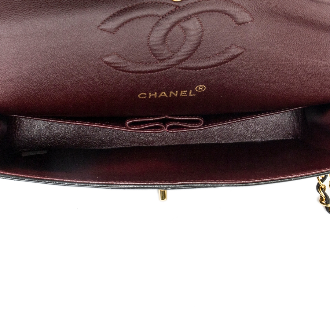 The classic double flap design provides both sophistication and practicality, opening to a well-organised interior suited to daily essentials. The interwoven leather and chain shoulder strap completes the design with a refined finish, allowing for versatile styling while maintaining the bag’s instantly recognisable aesthetic. Gold-tone hardware throughout contrasts beautifully against the deep black leather.