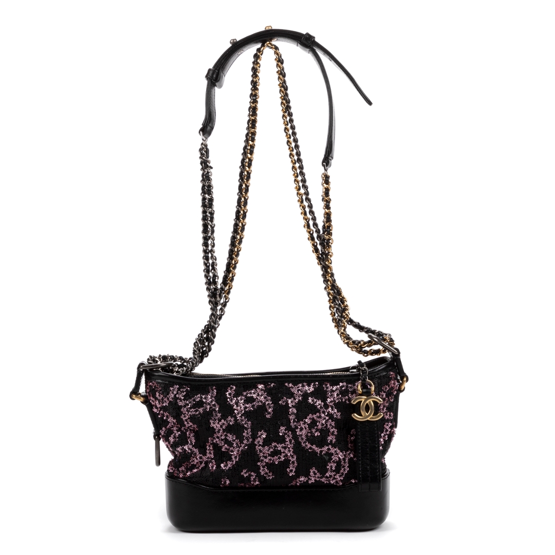 A vintage Chanel Gabrielle Sequins bag, combining black calfskin leather with shimmering sequin canvas for a striking and contemporary interpretation of a classic silhouette. The softly structured body is elevated by the contrast between smooth leather and textured sequins, while the iconic CC charm detail adds a refined and instantly recognisable Chanel signature.