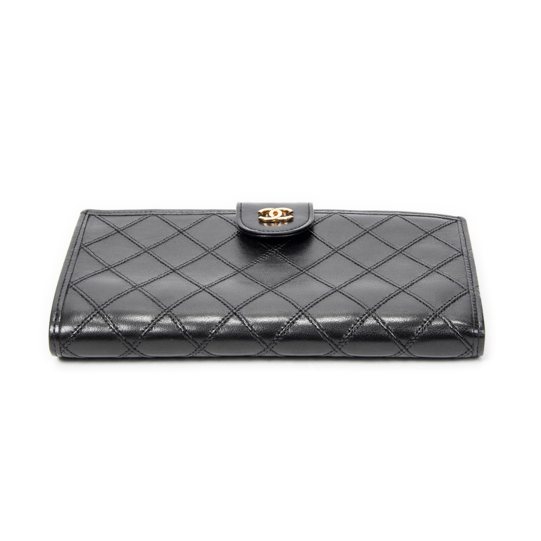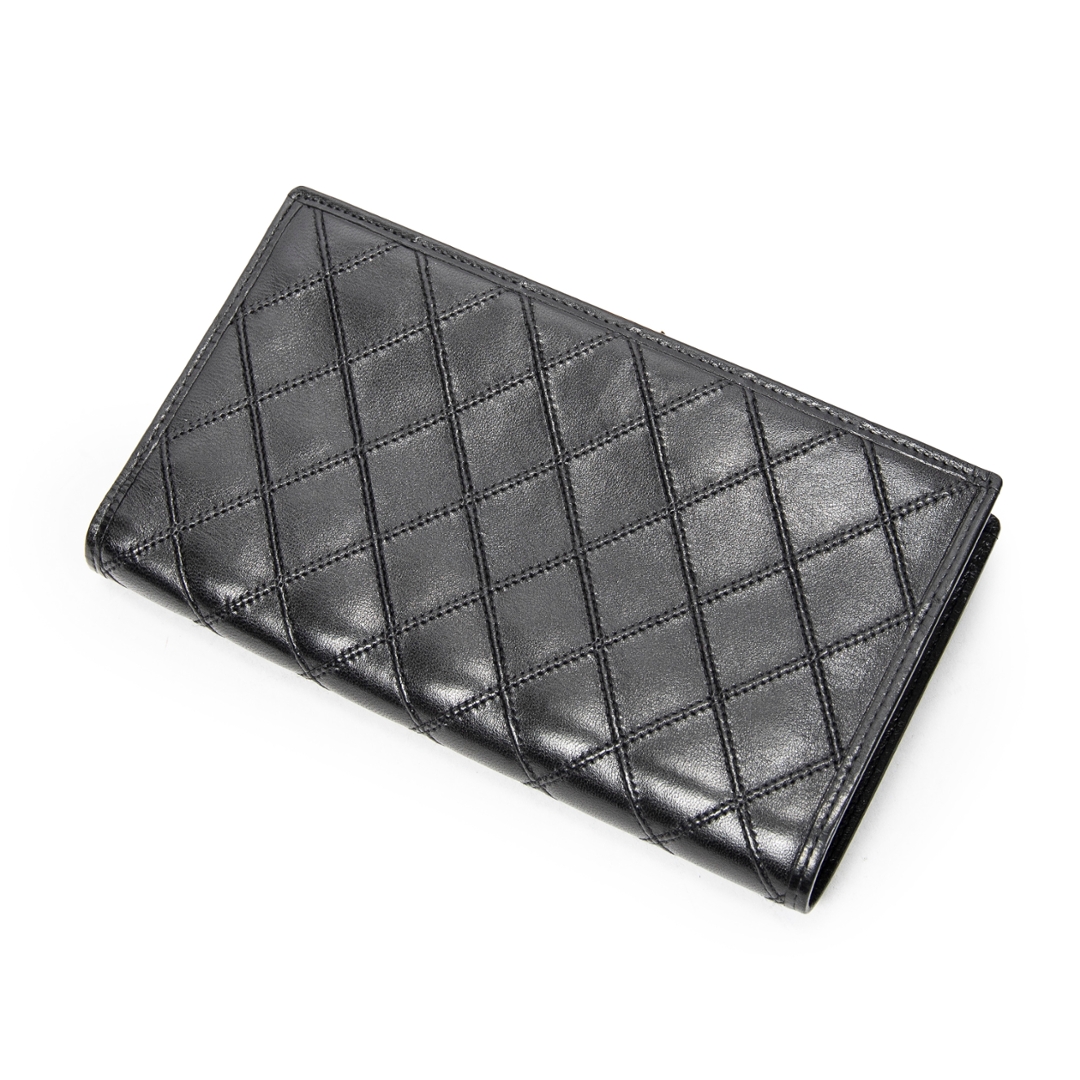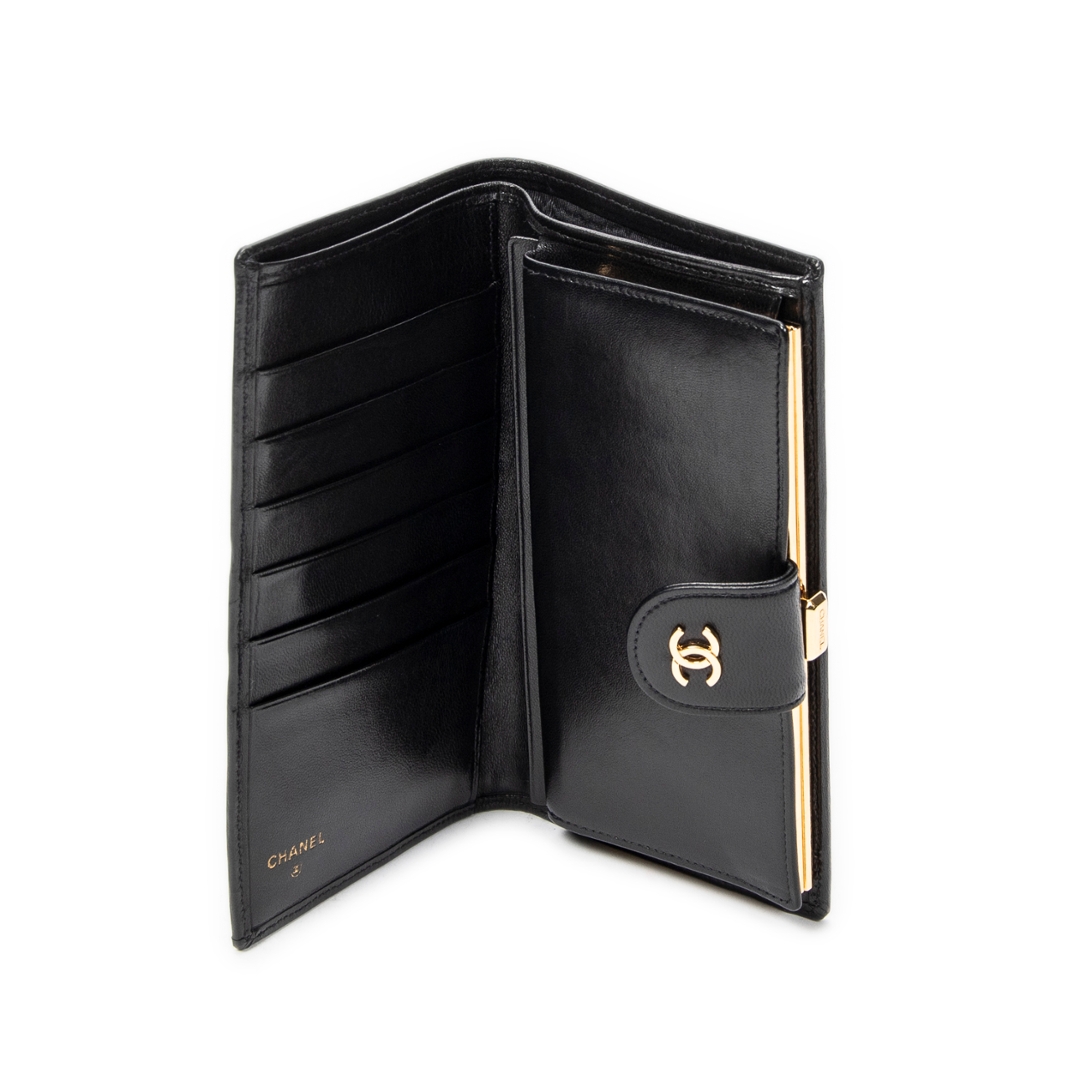 A vintage Chanel black calf leather Long French Purse Wallet bag with a certificate of authenticity, Approximately 10cm height, 18cm width.