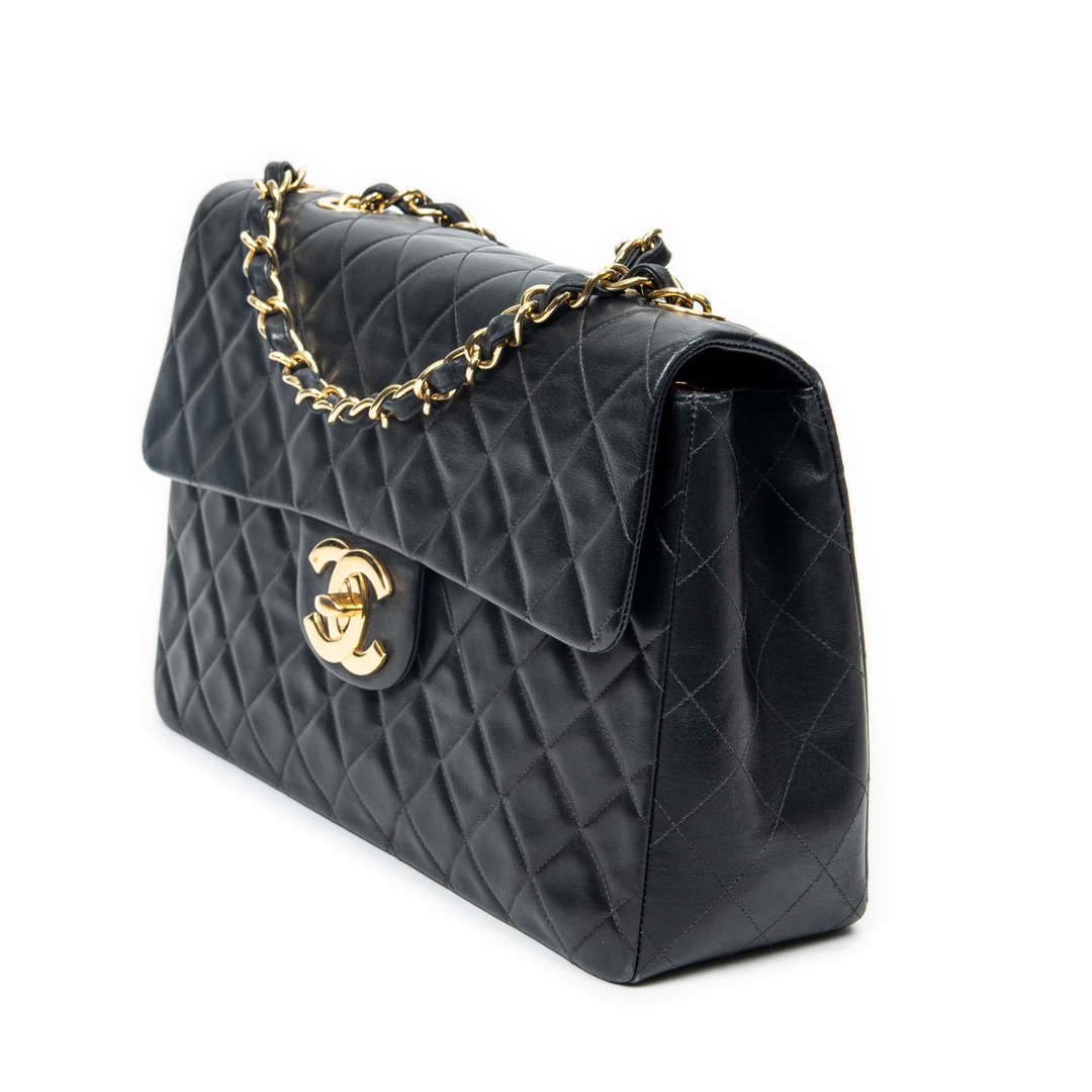 A vintage Chanel black quilted lambskin leather Maxi Jumbo XL Flap bag, an iconic statement piece that embodies the house’s timeless luxury and craftsmanship. Crafted from supple lambskin leather, the signature diamond quilting enhances the structured silhouette, while the oversized CC turn-lock fastening in gold-tone hardware delivers a bold and instantly recognisable Chanel signature.