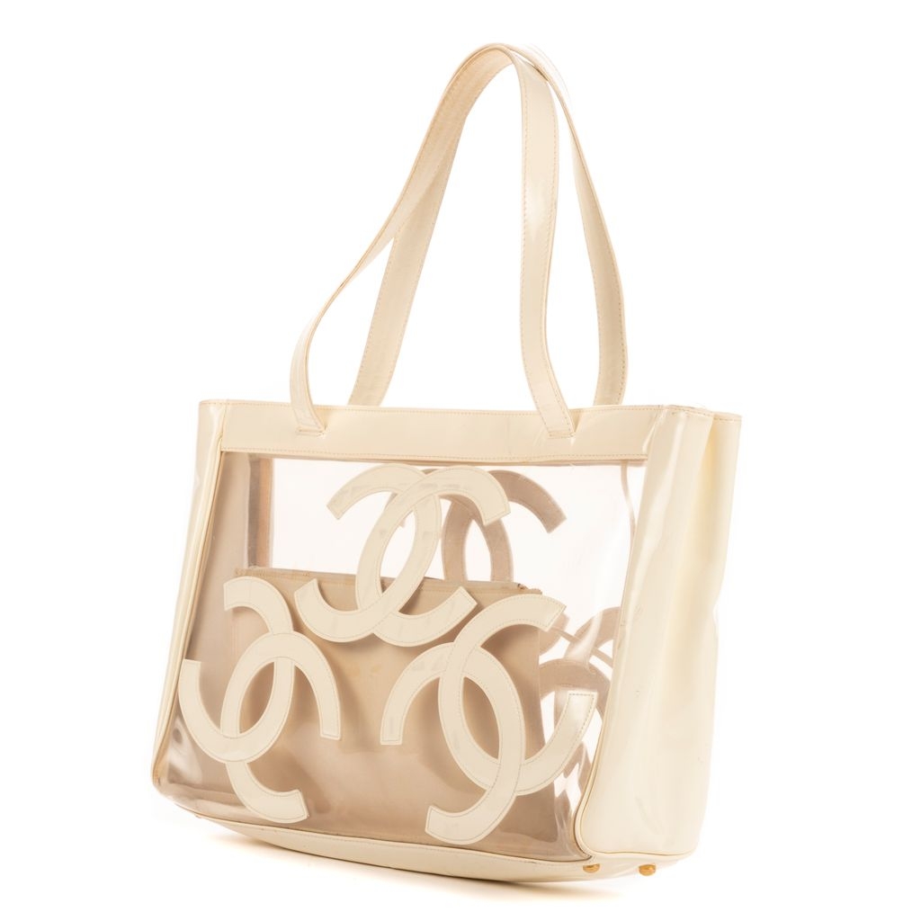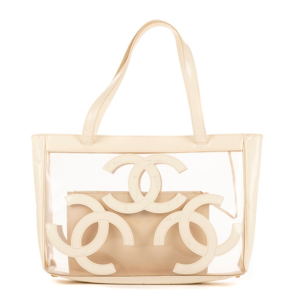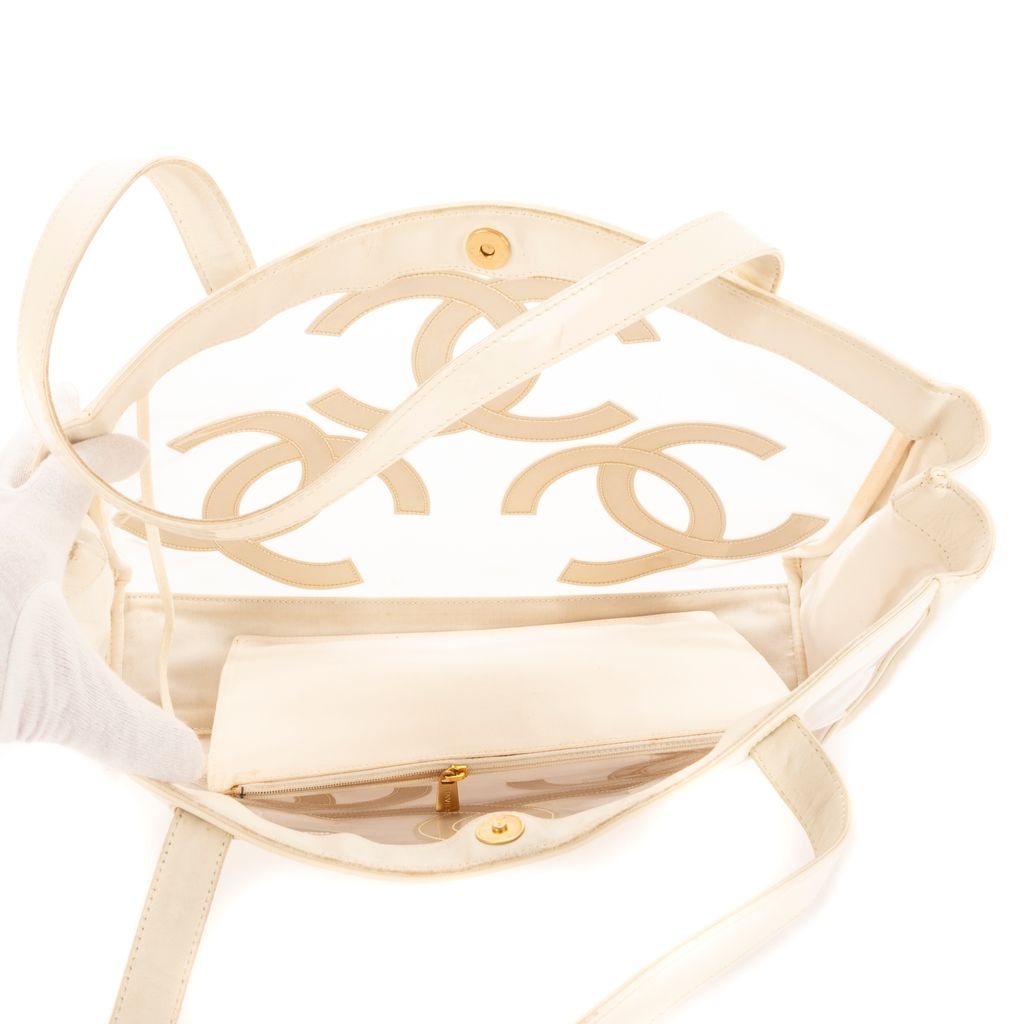 A vintage Chanel white vinyl canvas Triple Logo Tote bag with a certificate of authenticity, Approximately 26cm height, 37cm width.