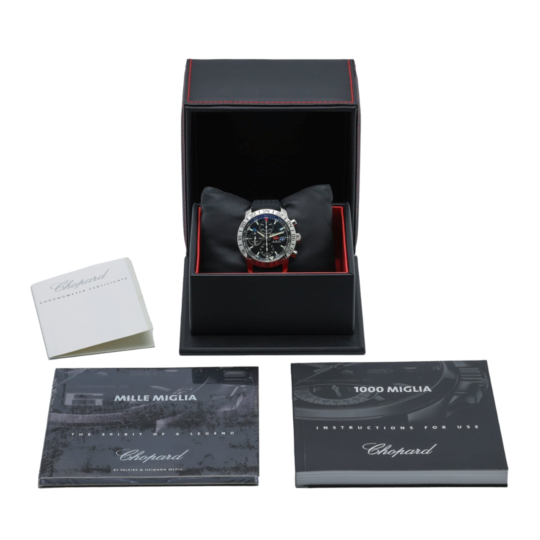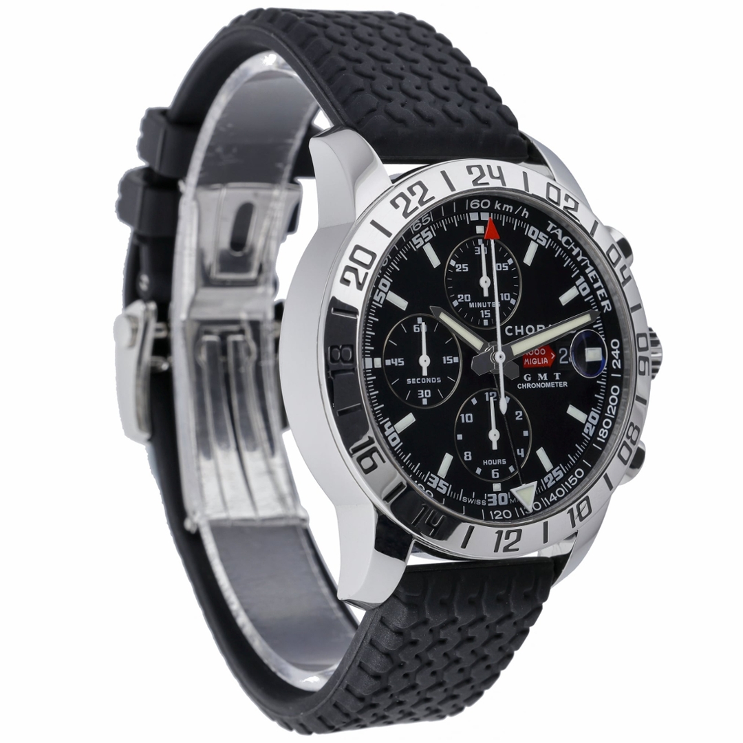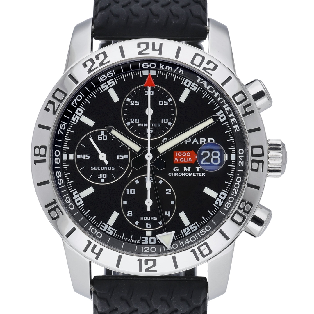 The 42mm stainless steel case is paired with a black rubber strap, while the black dial features contrasting sub-dials, a GMT function and a tachymeter scale, delivering strong motorsport character and everyday practicality. Powered by an automatic chronometer-rated movement, this model reflects Chopard’s long-standing partnership with the iconic Mille Miglia rally.