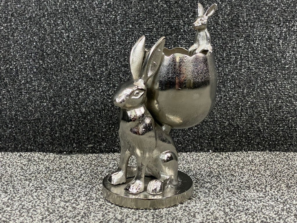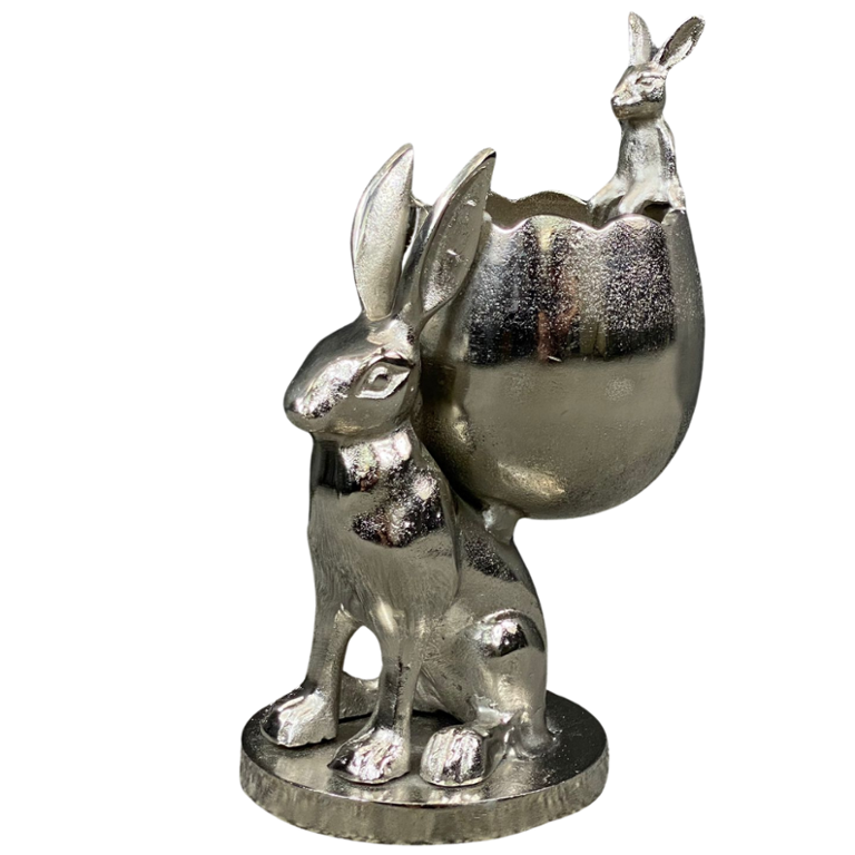 A cracked egg-shaped vessel is carried on the hare's back, emerging from which is a small, equally detailed leveret, peeking out playfully. The interaction between the two figures evokes themes of nurturing and protection. The craftsmanship and weighty chrome finish provide a modern, elegant touch to the sculpture, making it an eye-catching display piece suitable for various settings, from home décor to art collections.