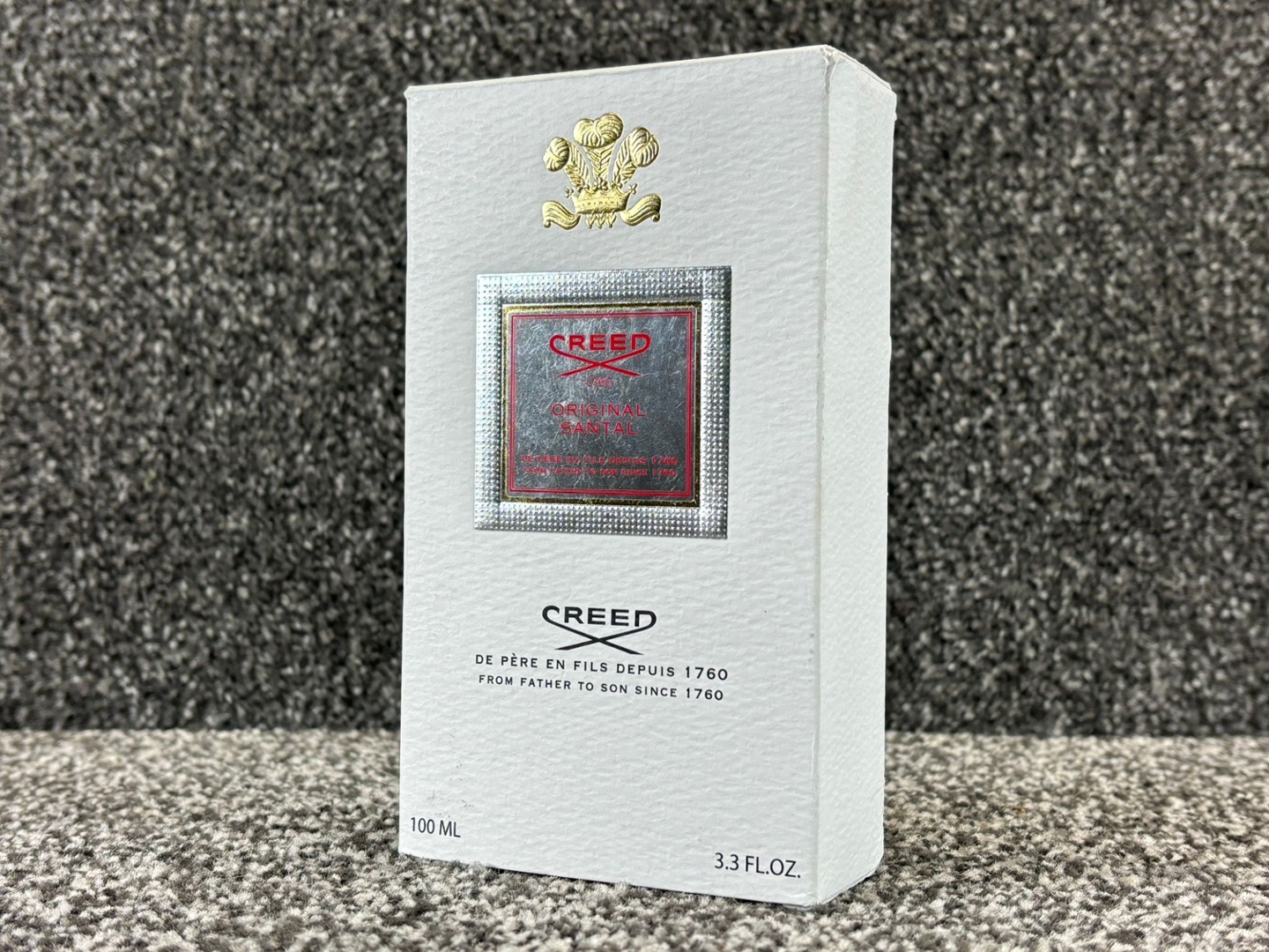 A bottle of Creed - Original Santal Eau De Parfum in a presentation box.