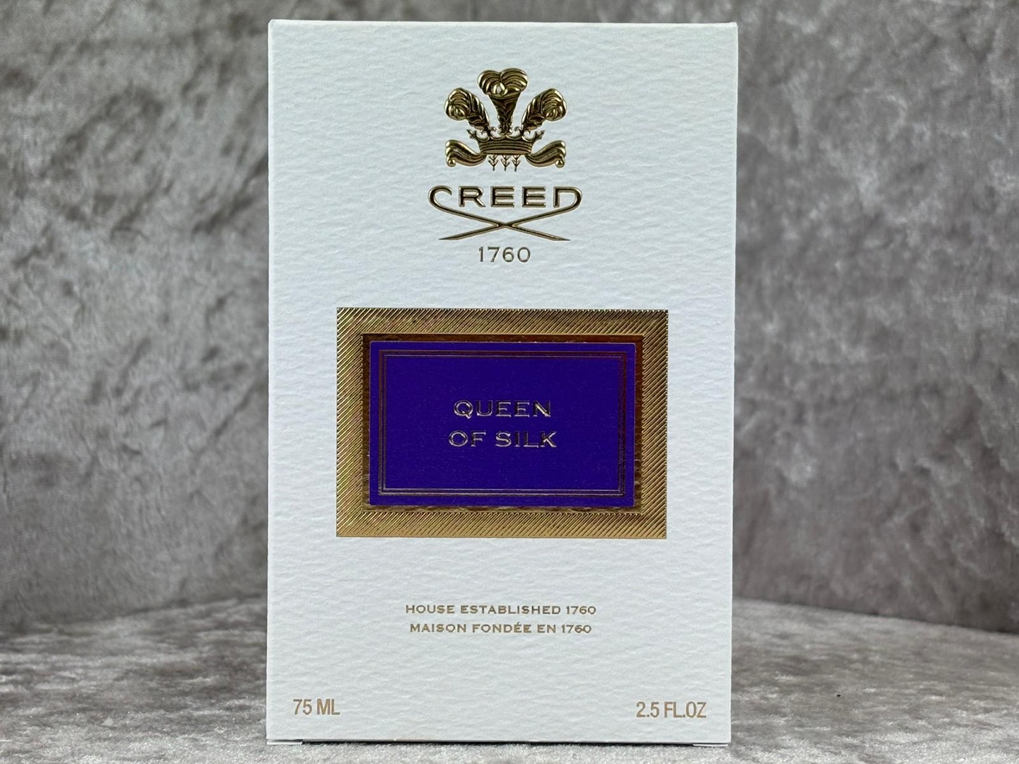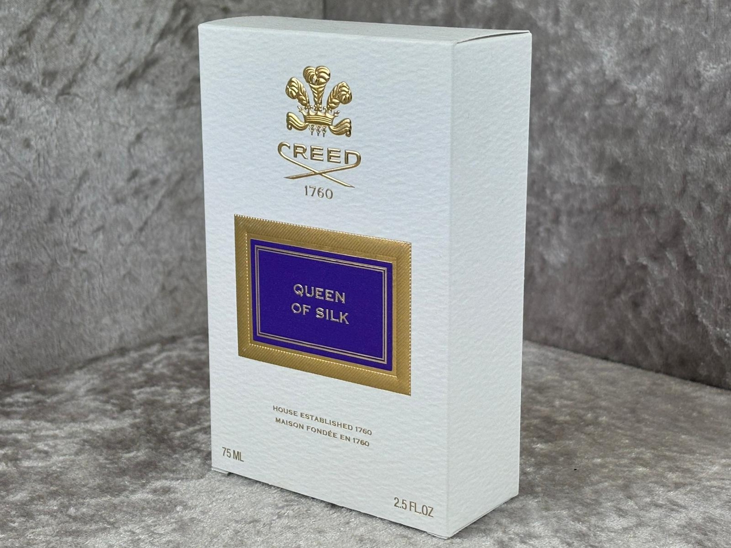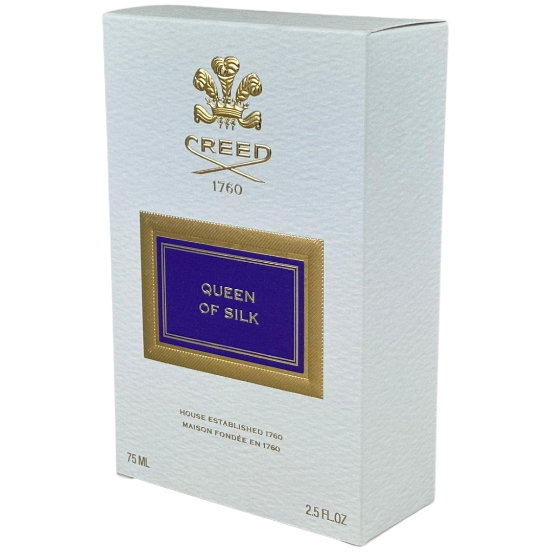 A 75ml bottle of Queen of Silk Eau De Parfum by Creed, presented in its official presentation box. This luxurious creation embodies opulence and refinement, delivering a fragrance that feels rich, radiant and unmistakably elegant from the very first spray.